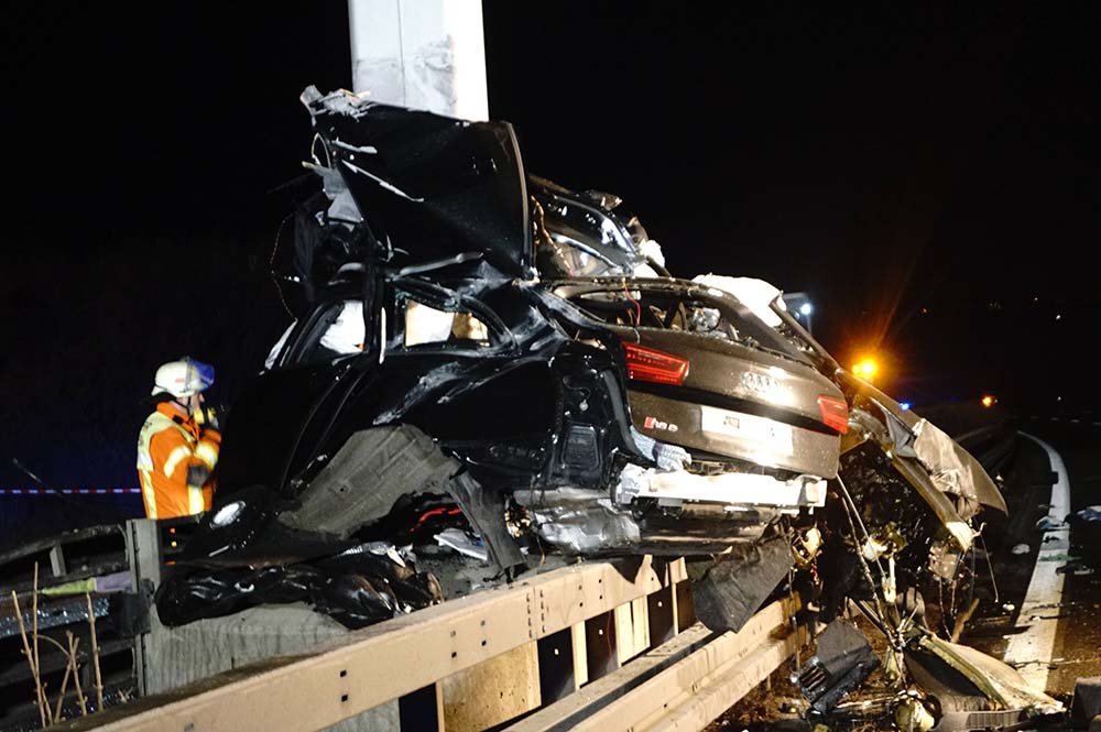 A korlátozás nélküli szakaszon a kb. 200 km/h-val száguldó Audi elé kijött egy pótkocsi nélküli nyerges vontató, és a hátsó kereke megdobta az autót.