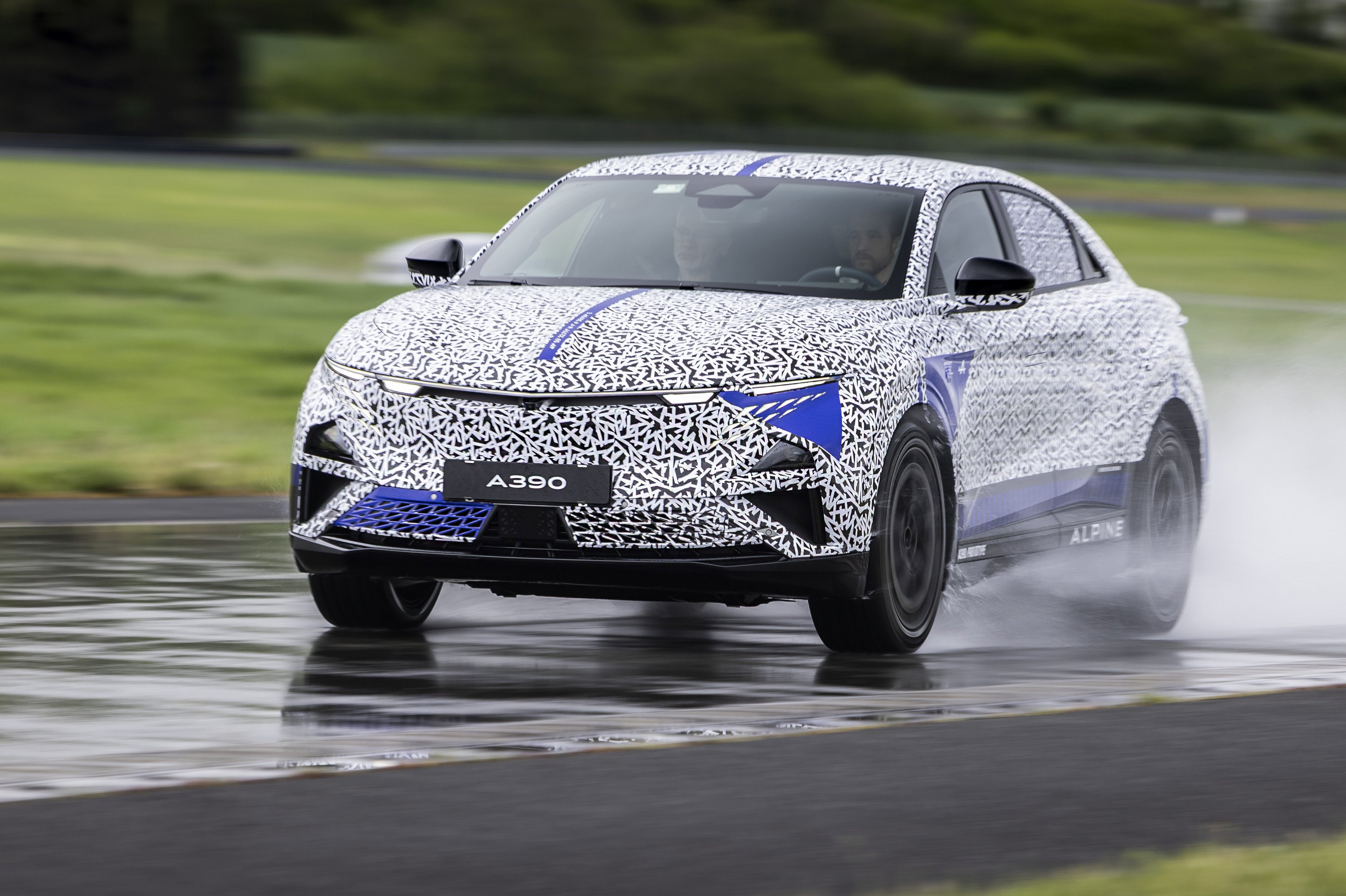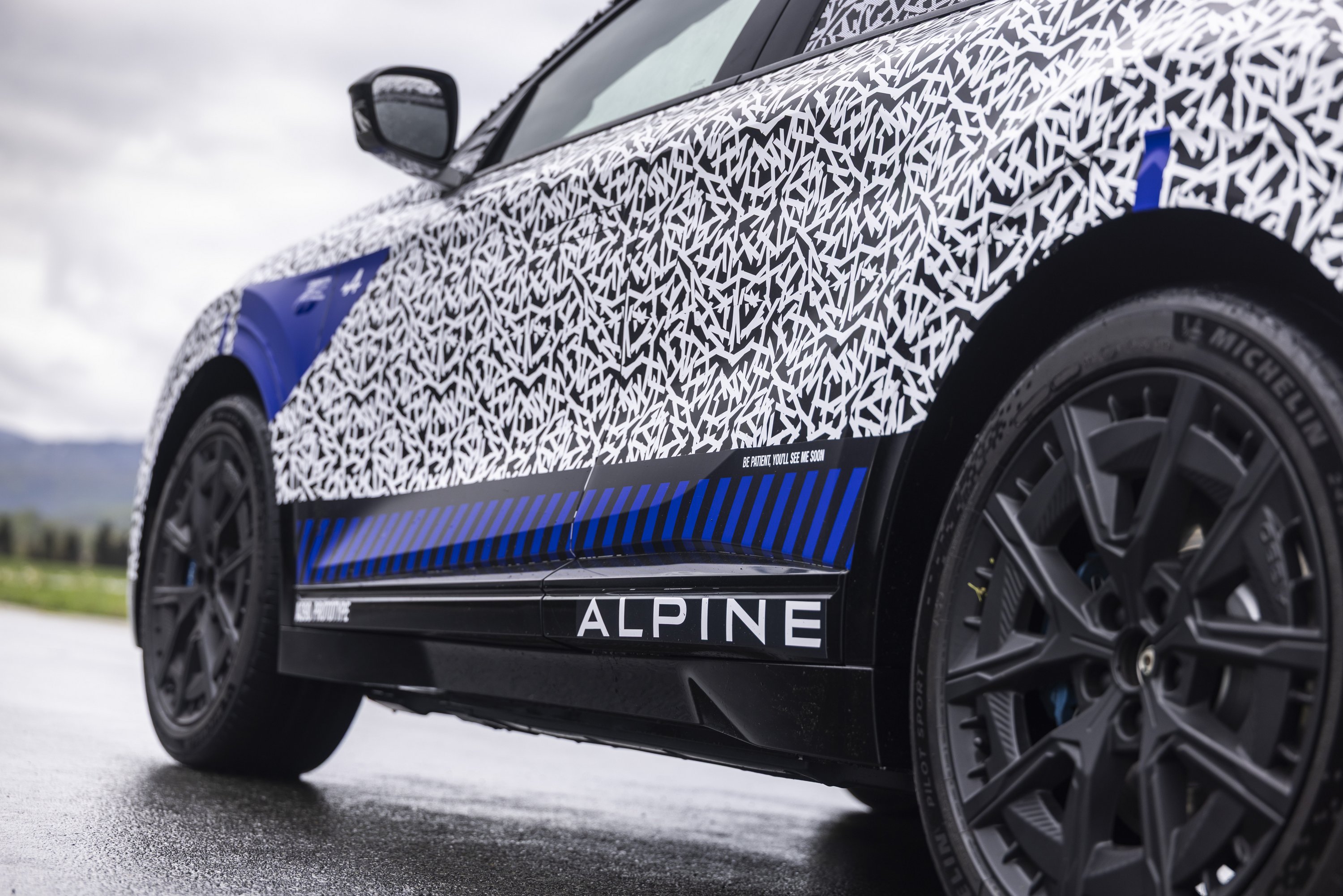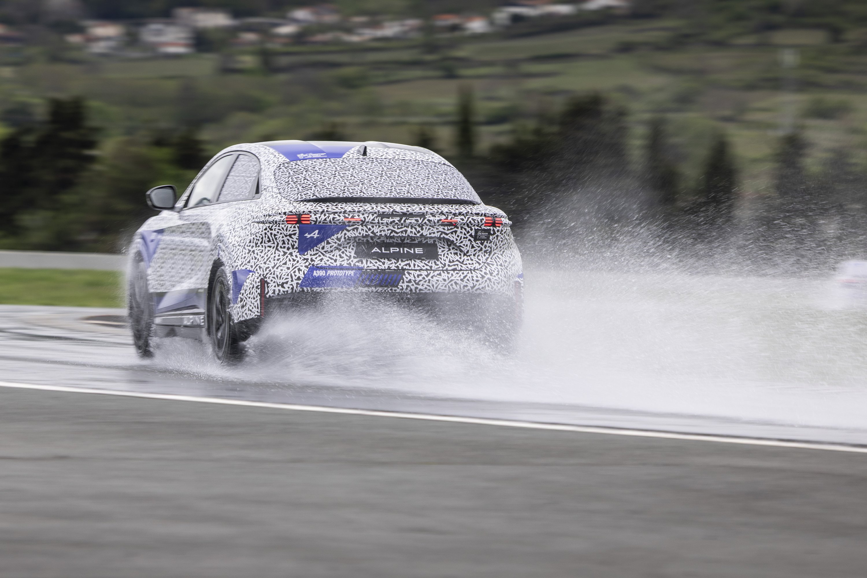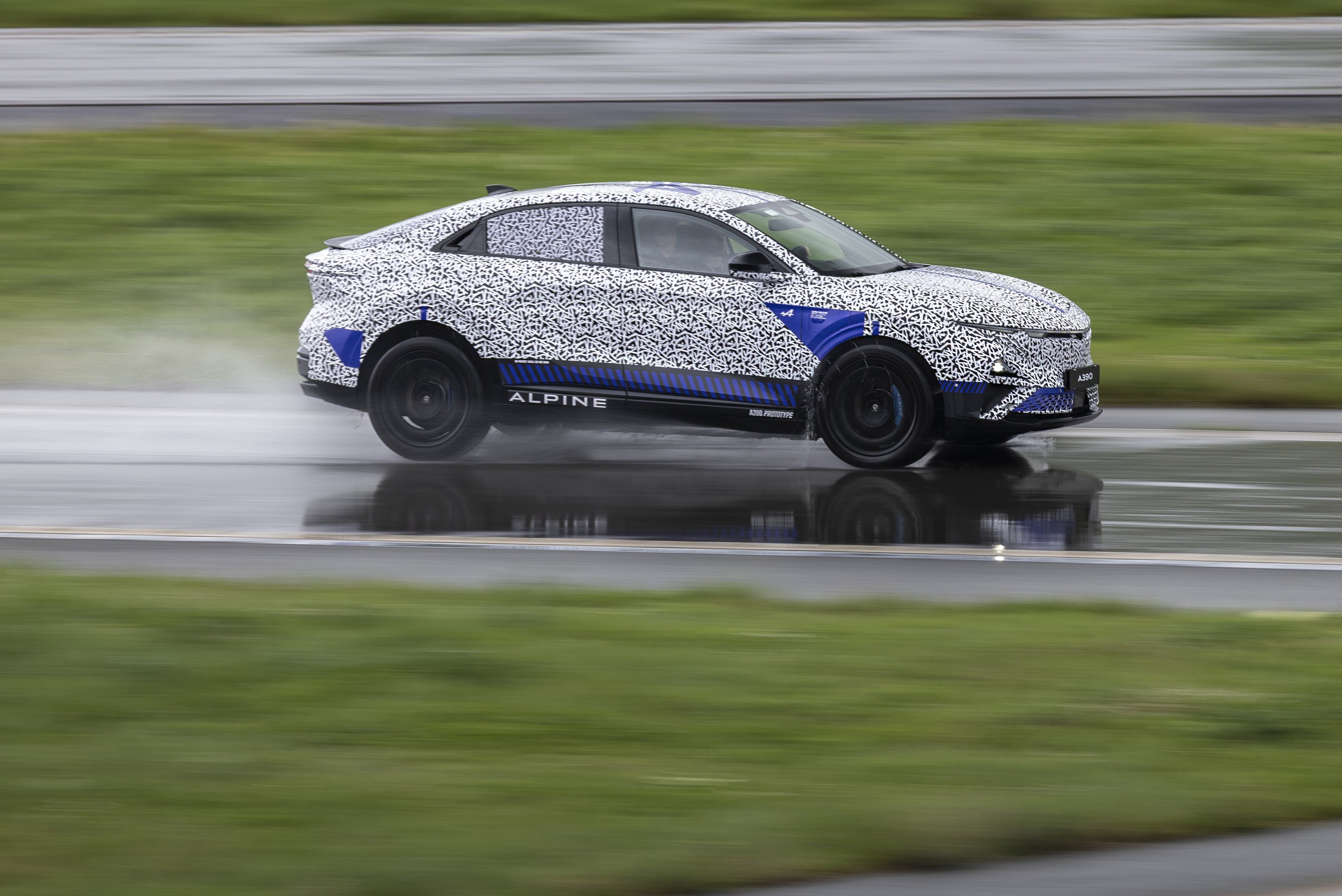 Ezeket a képeket a Michelin 4,1 kilométeres tesztpályáján, a Ladoux technológiai központban készítette az Alpine. A fellocsolt aszfalton a három villanymotoros hajtásláncot vezérlő technológiákat, így például az aktív nyomatékvektor-szabályozást, valamint az öt különböző üzemmódot (köztük a már említett versenypálya-beállítást) ellenőrzik.