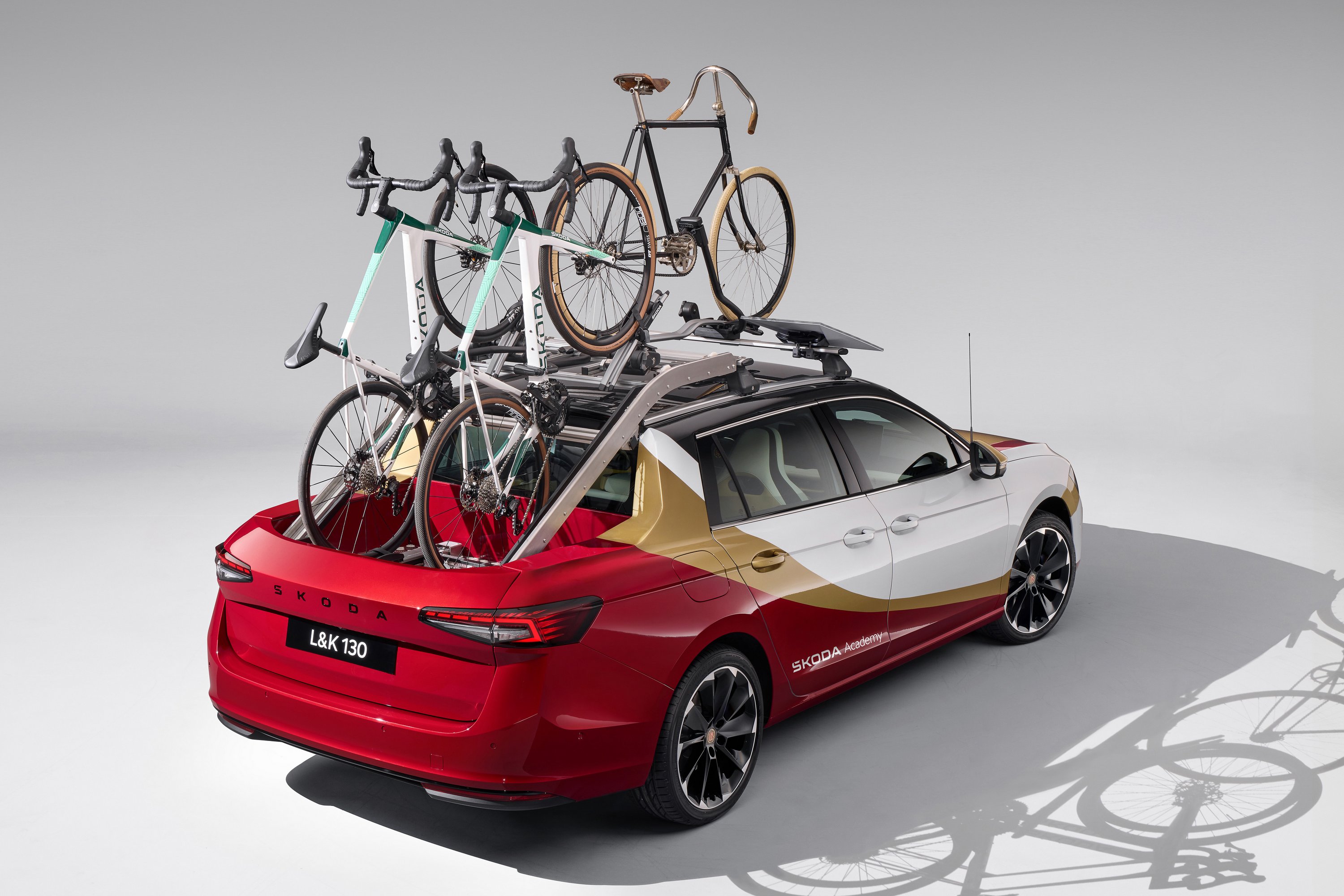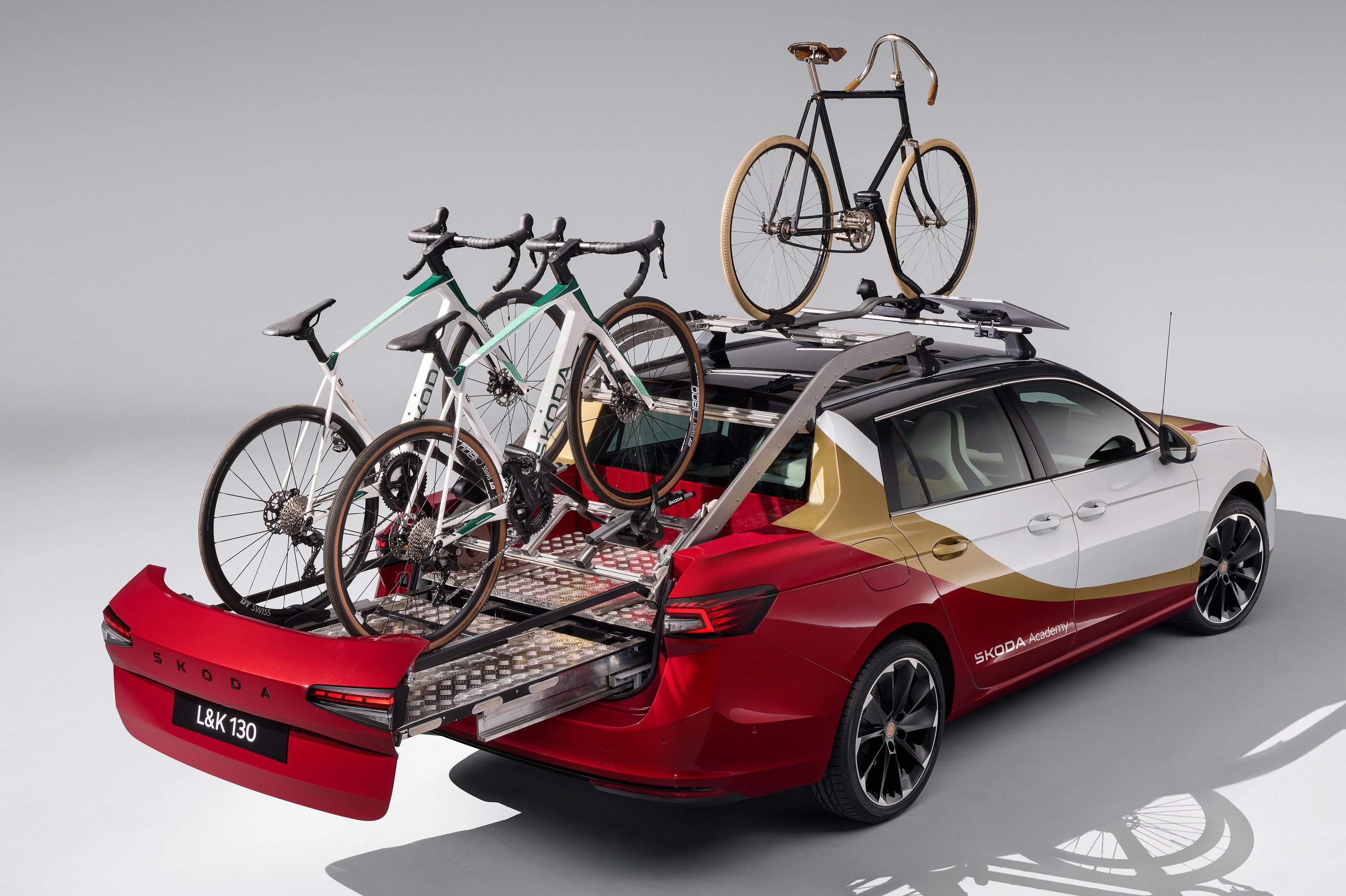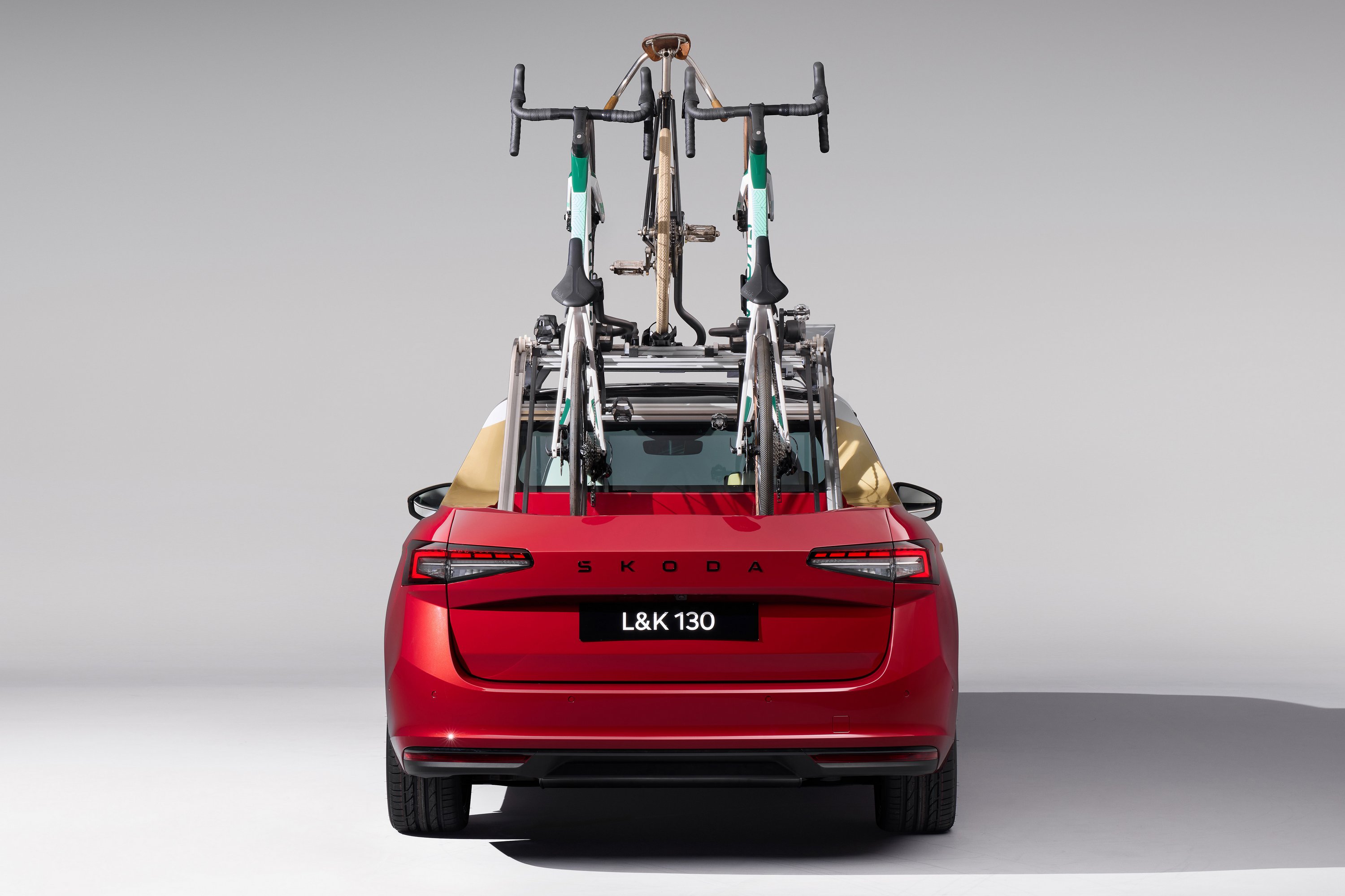 A Škoda L&K 130 elnevezésű tanulmány alapja egy plug-in hibrid Superb kombi – ez önmagában is újdonság. A hosszú csomagterű autóból pick-upot építettek, ami adja magát, eddig semmi különös nincs az elképzelésben. Nem akármilyen platósról van azonban szó: kifejezetten versenykerékpárok szállítására, illetve a versenyzők támogatására szolgáló, átgondolt jármű született.