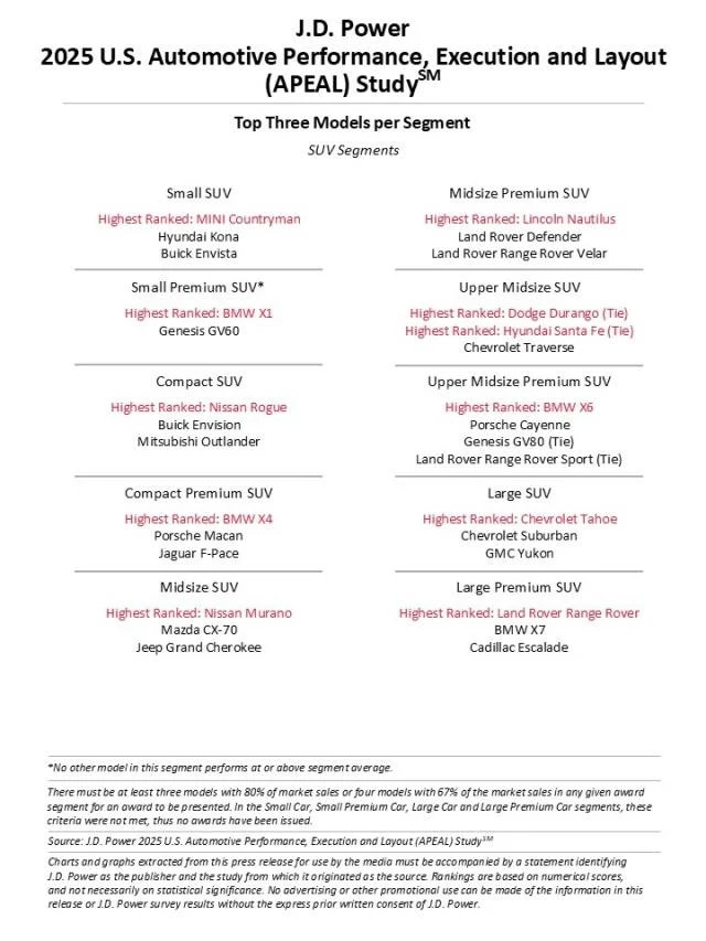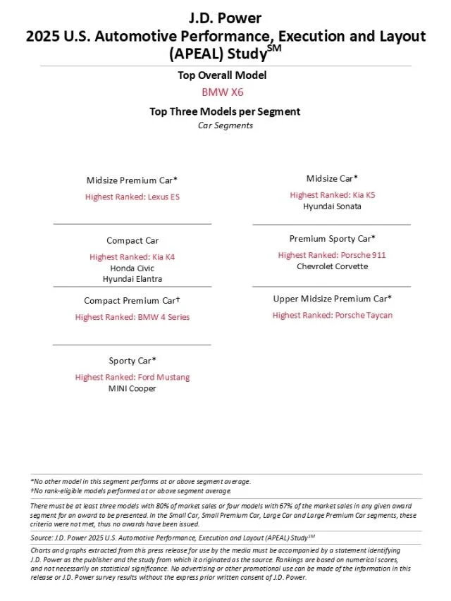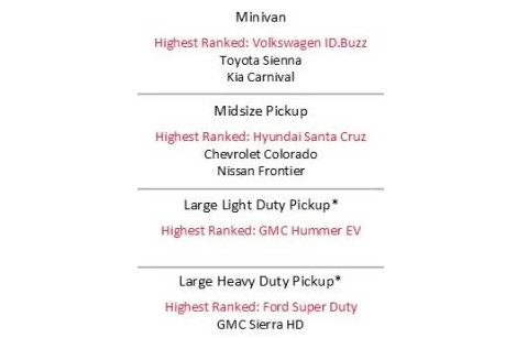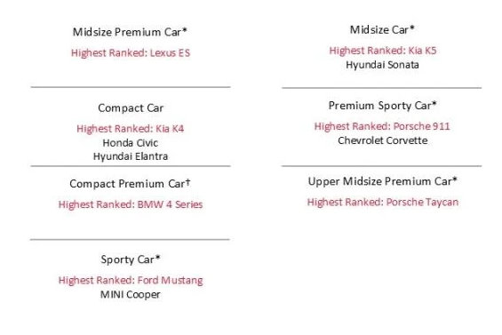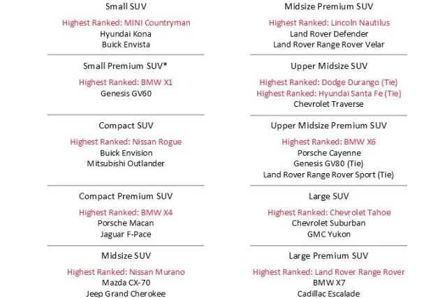 A BMW Csoport öt kategóriaelsőséget (négyet a BMW, egyet a Mini) szerzett, a Hyundai–Kia négyet (kettő-kettő). A Ford Csoport hármat (kettő Ford, egy Lincoln), akárcsak a VW Csoport (egy VW, kettő Porsche). A General Motors (Chevrolet és GMC) és a Nissan kettő-kettő, a Jaguar Land Rover (Range Rover), a Stellantis (Dodge) és a Toyota Csoport (Lexus) egy-egy méretosztályban hódított.