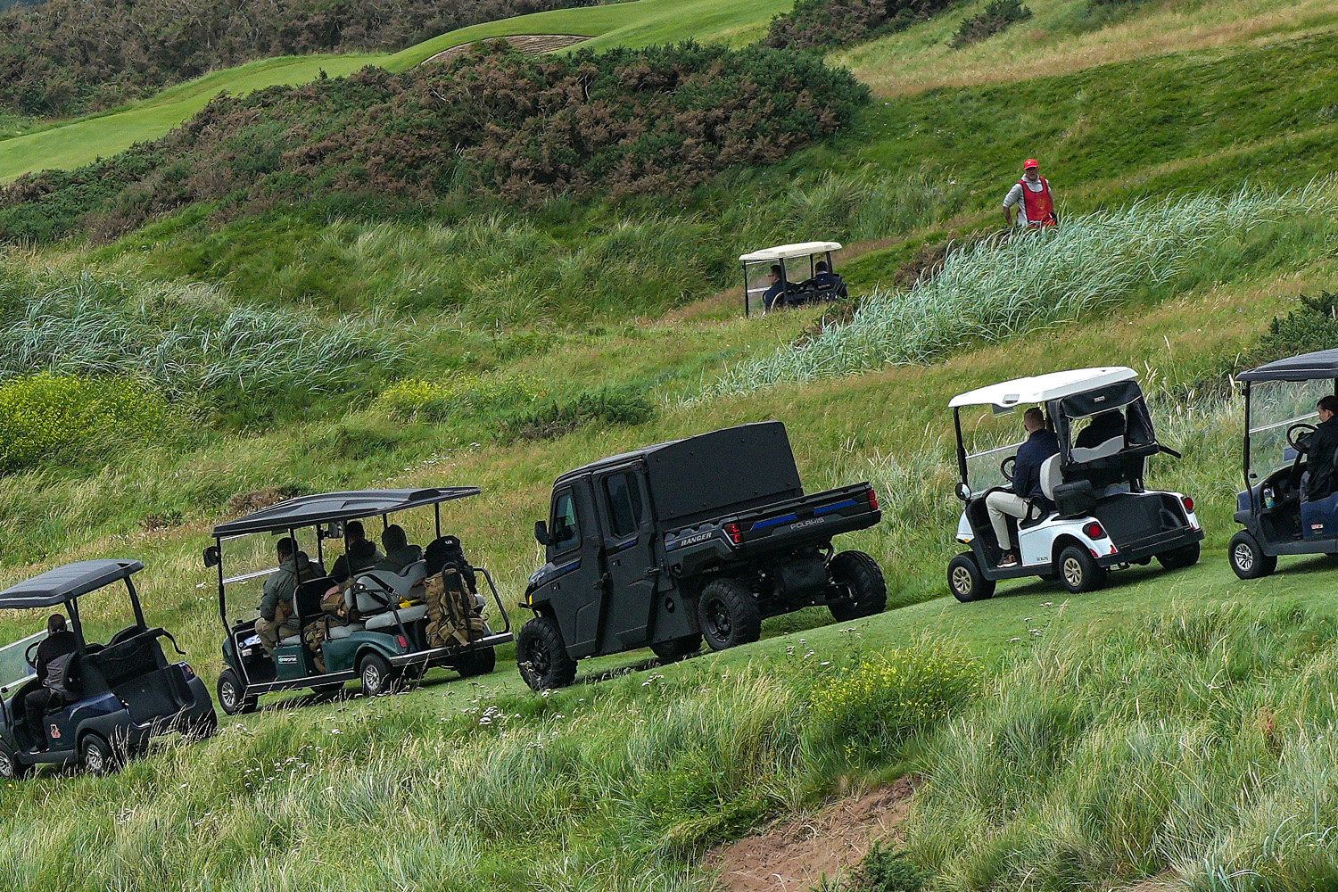 A hétvégén Trump a skóciai Turnberry golfpályán ütötte el az időt, ám nem akárhogyan: a fehér, hagyományos golfkocsija mögött egy fekete, erősen átalakított, terepjáró stílusú jármű haladt – amit a sajtó azóta csak Golf Force One-ként emleget (az Air Force One elnöki repülőgép után). A szokatlan jármű szinte biztosan páncélozott, legalábbis a járművédelmi szakértők szerint, akik a fotók alapján több árulkodó jelet is felfedeztek – számolt be róla a The Telegraph.