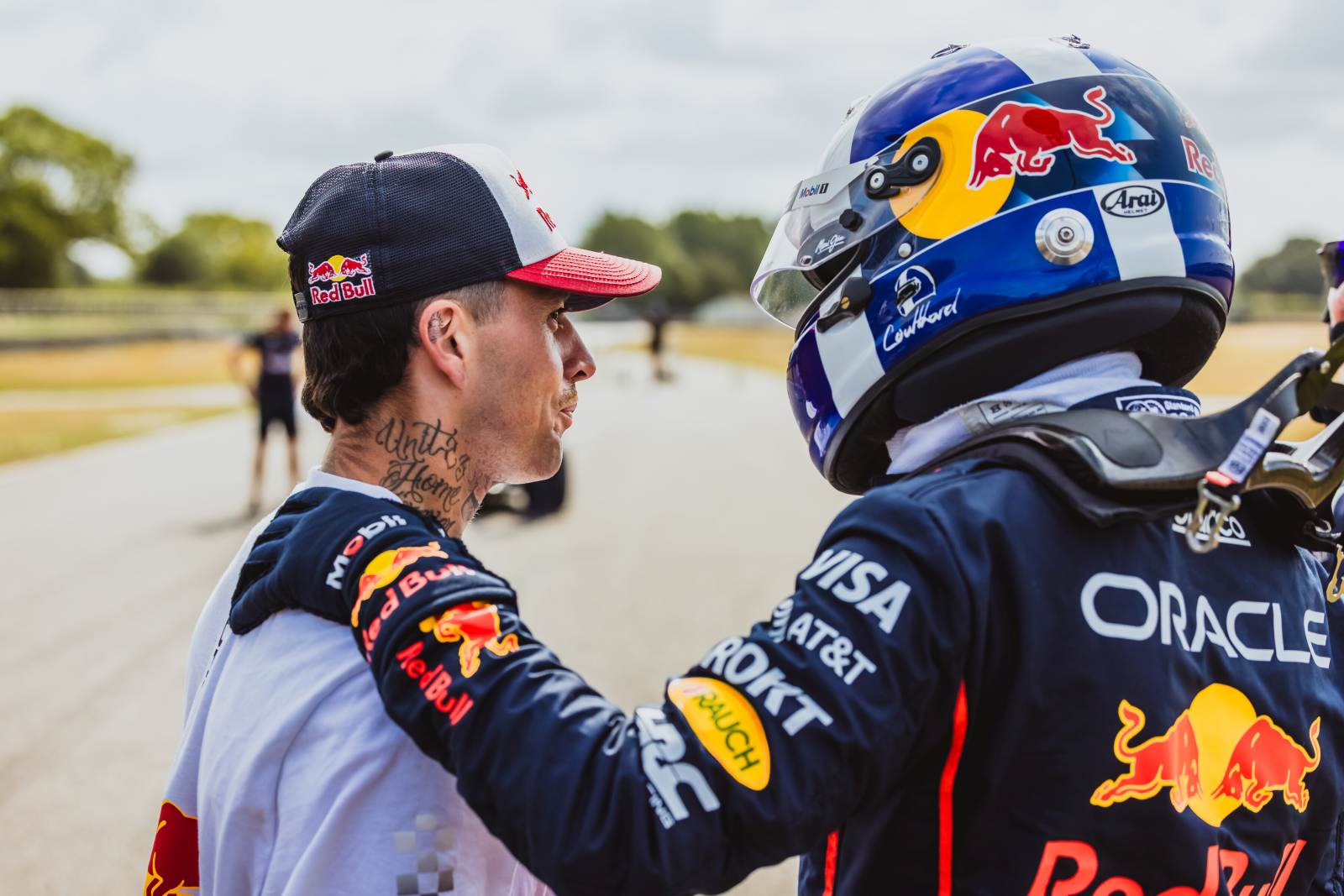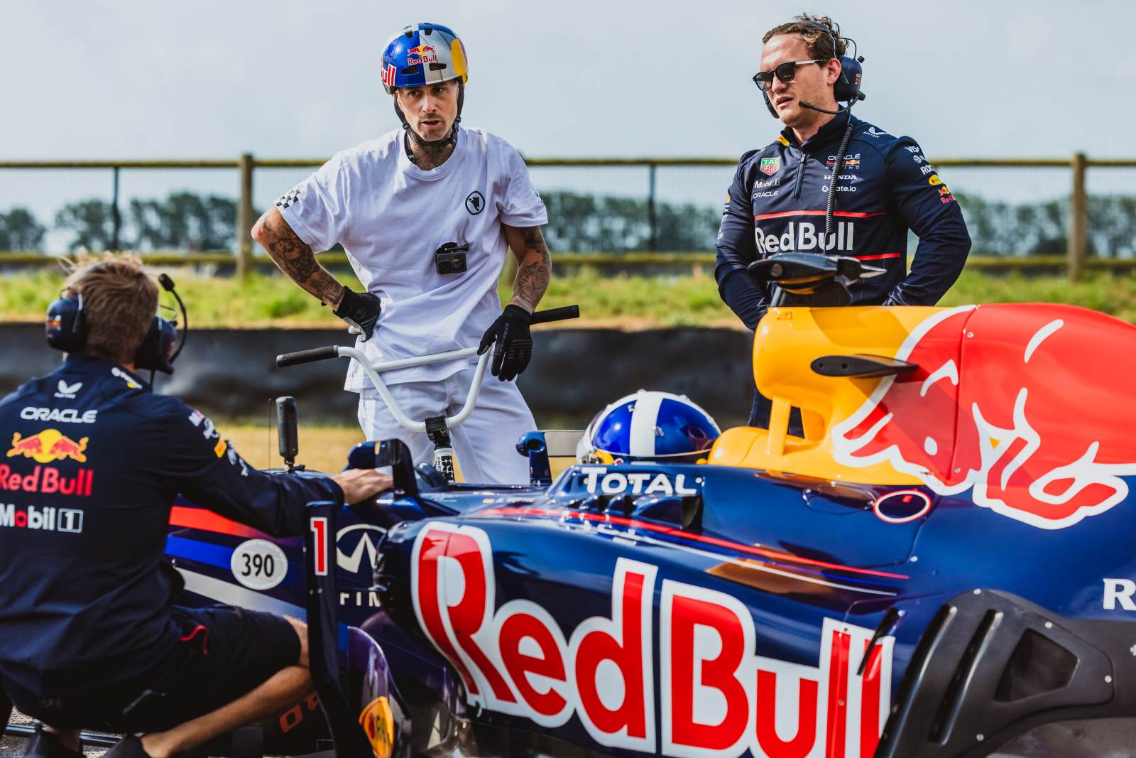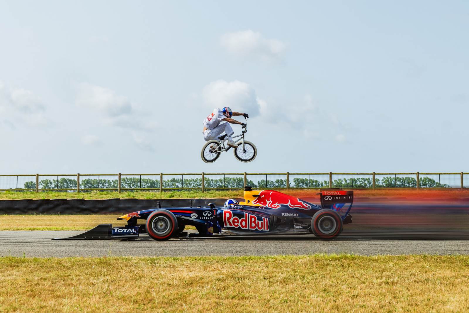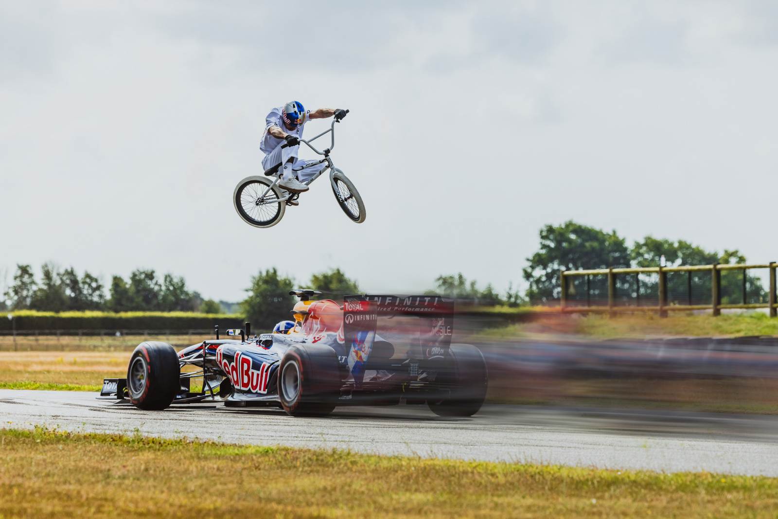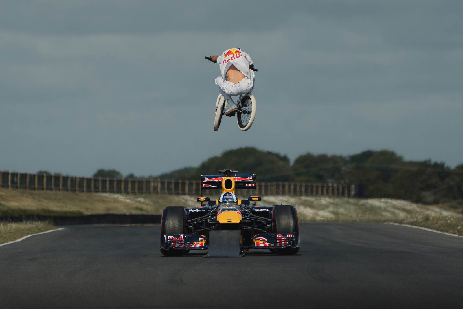 Néhány héttel ezelőtt egy másik, valamelyest hasonló Red Bull-os produkció is zajlott: augusztus elején a skót BMX-es, Kriss Kyle ugratott át egy mozgó Forma-1-es autó felett. A 13-szoros futamgyőztes David Coulthard Sebastian Vettel 2011-es világbajnoki autóját, az RB7-est vezette a kerékpáros felé, akinek szintén tökéletes időzítéssel kellett megérkeznie az apró rámpára, hogy aztán legalább 130 cm magasra emelkedve repüljön át az autó felett a goodwoodi pályán.
