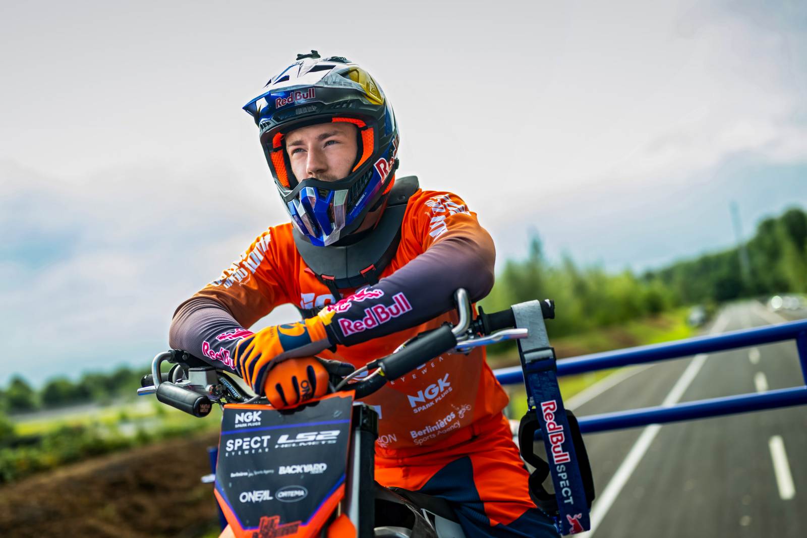 Őrületes mutatványt hajtott végre kétkerekűjével egy Red Bull-sportoló, a német Luc Ackermann egy mozgó kamionról a másikra ugratott át úgy, hogy közben egy kapu felett is átrepült.