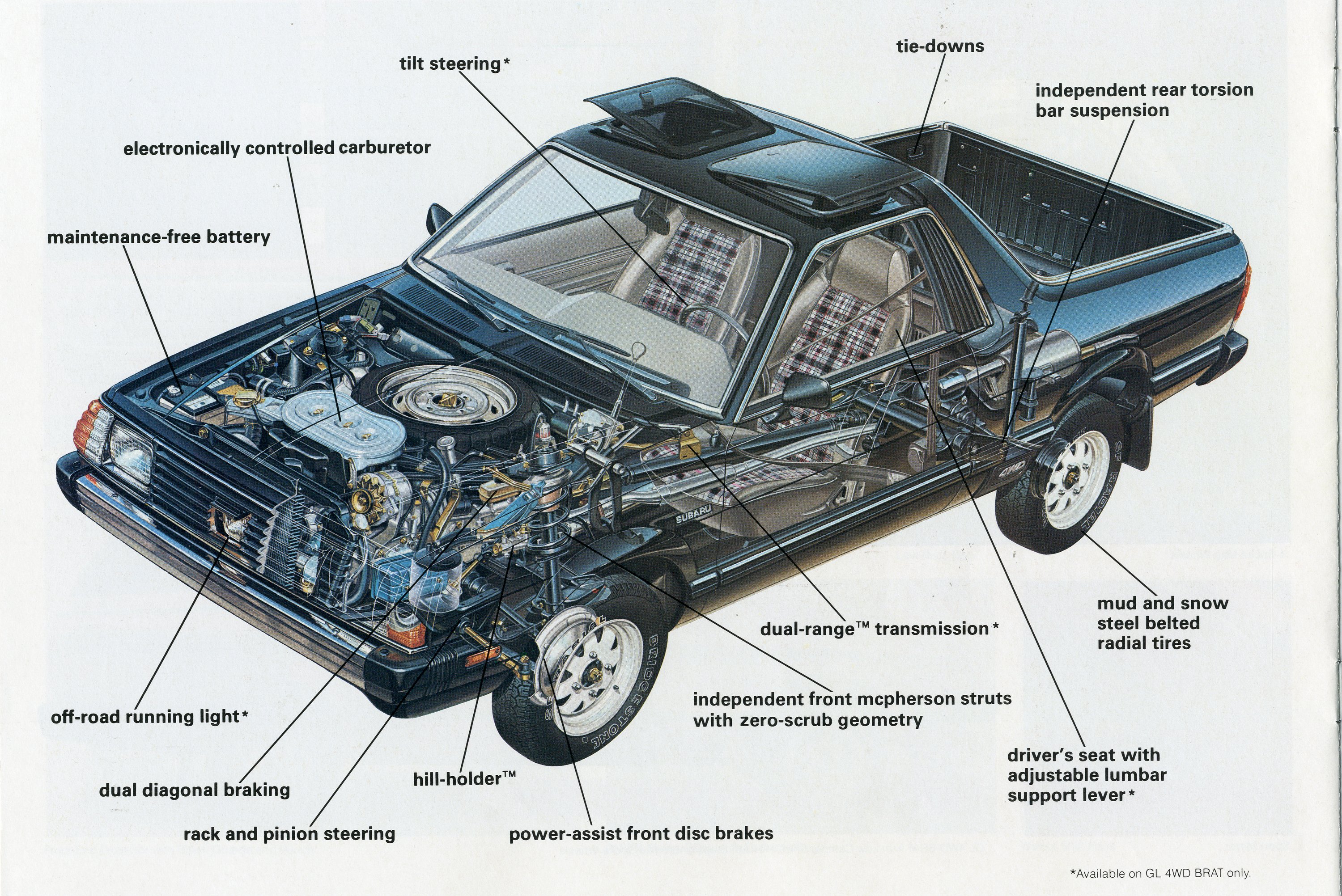 A Subaru Brat 1978 és 1994 között két generációban készült. A Subaru Leone (műszakilag az Impreza, presztízsben a Legacy elődje) személyautó alapjain nyugvó, egy üléssoros, platós jármű kifejezetten a márka észak-amerikai importőrének kérésére született meg, és mivel eleve összkerékhajtású modellből készült, komoly helyzeti előnnyel bírt a hasonló formátumú konkurensekkel szemben. Hamar világszerte népszerűvé vált, végül jóformán csak Japánban nem forgalmazták, még Európába is eljutott.