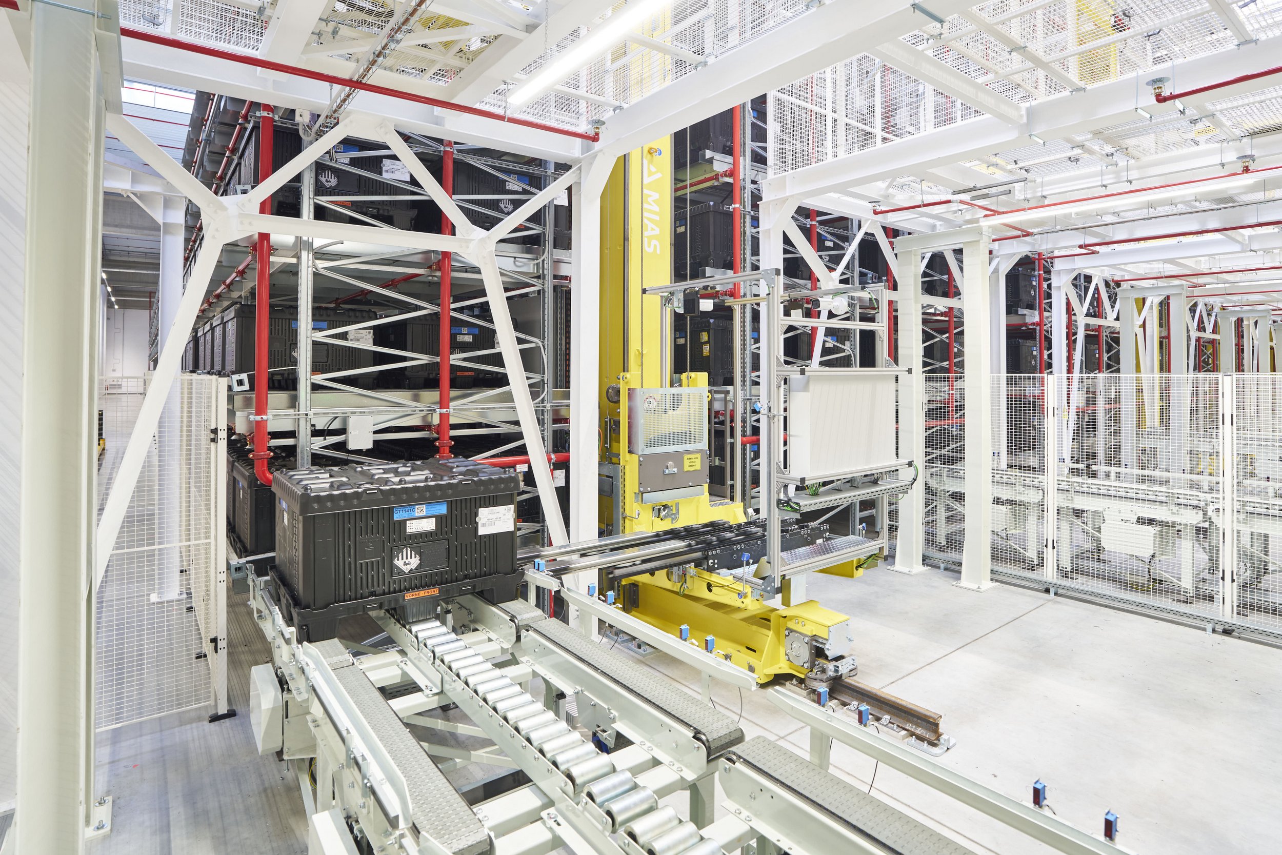 A tengeren túlról érkező cellákat automatizált gépsorok szállítják be a raktárba, majd onnan tovább a gyártósorokhoz – a futószalagok összesen 2,5 kilométeren keresztül futnak.