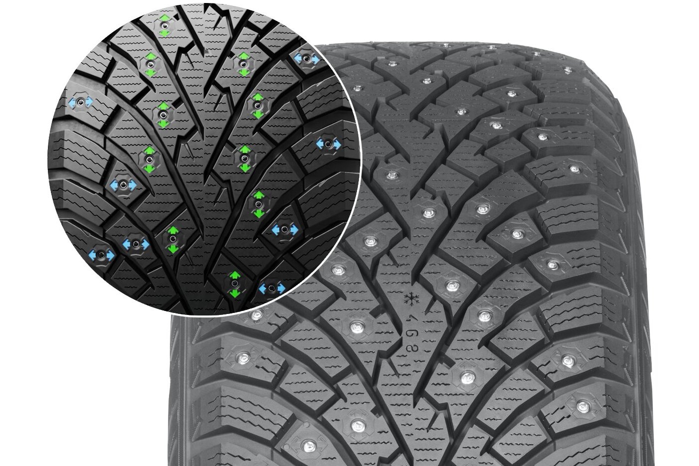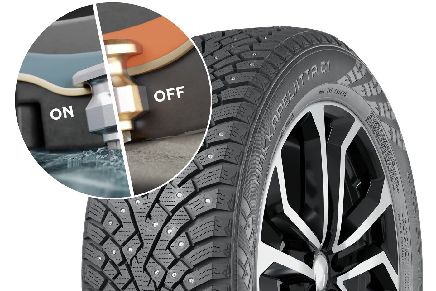 A technológia lényege, hogy a futófelületet több, eltérő minőségű gumikeverékből rétegezik. Az egyik különösen érzékeny a hidegre: mínuszban megkeményedik, melegben lágyabb lesz. Erre a rétegre támaszkodnak rá a szögek, amelyeket hidegben a helyükön tart az alsó réteg, melegben viszont engedi, hogy benyomódjanak.