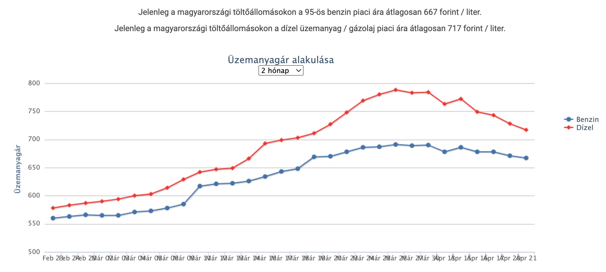 A benzin piaci ára jelenleg 72, a gázolajé 102 forinttal magasabb a védett áraknál. A március végi csúcsnál (788 forint) a gázolaj piaci ára még 173 forinttal volt magasabb a védett árnál.