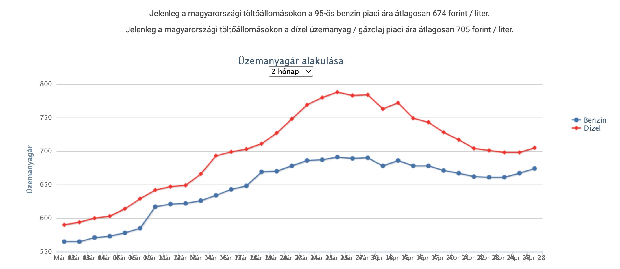 A benzin piaci ára jelenleg 79, a gázolajé 90 forinttal magasabb a védett áraknál. A március végi csúcsnál (788 forint) a gázolaj piaci ára 173 forinttal volt magasabb a védett árnál.