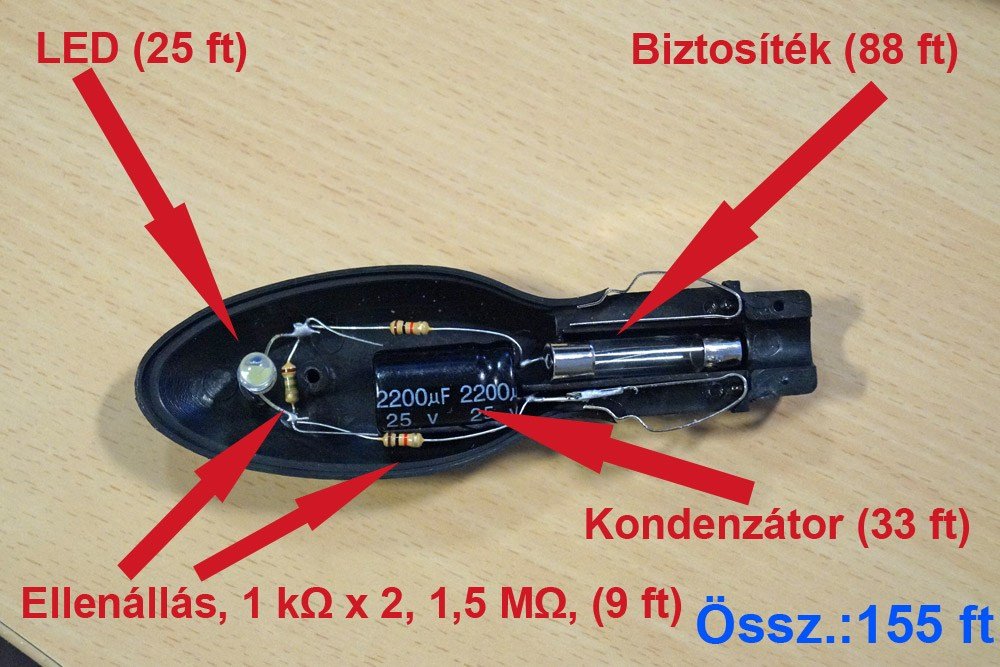 Mert hát mitől is csinálna bármit a szivargyújtóban egy LED, egy biztosíték meg három ellenállás? Más ugyanis nincs a műanyagházban, az egész hóbelevancban nincs kétszáz forint ára alkatrész: