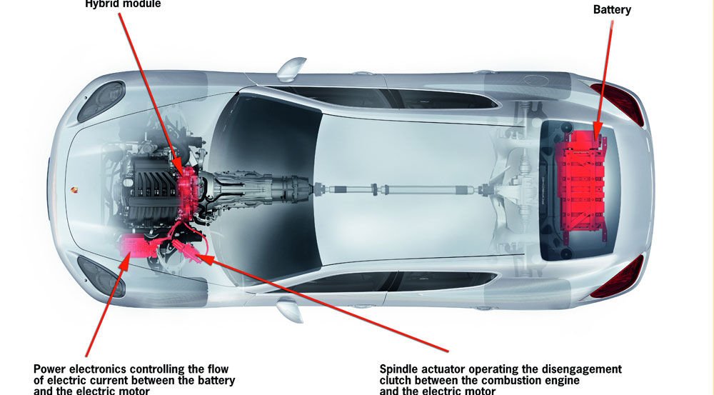 A hibridhajtású, várhatóan 2011-ben megjelenő Panamera a Cayenne technikáját örökli. Mindkét típusban a V6-os benzinest egészíti ki elektromos motor. A villanymotor a benzines motor és a váltó között lakik, gyorsításkor a rásegítéshez szükséges áramot a csomagtérpadló alá telepített akkumulátorokból nyeri.