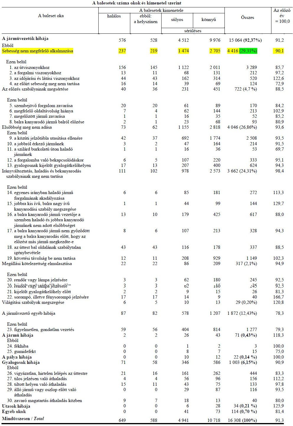 Az előzés szabályainak megsértése: 40 halálos baleset. Elsőbbség meg nem adása: 73 halálos baleset. Áttérés az út bal oldalára: 43 halálos baleset. Sorompó, fénysorompó tiltása ellenére sínre hajtás: 17 halálos baleset. Figyelmetlen, gondatlan vezetés: 59 halálos baleset. Gyalogos vigyázatlan, hirtelen úttestre lépése: 21 halálos baleset.