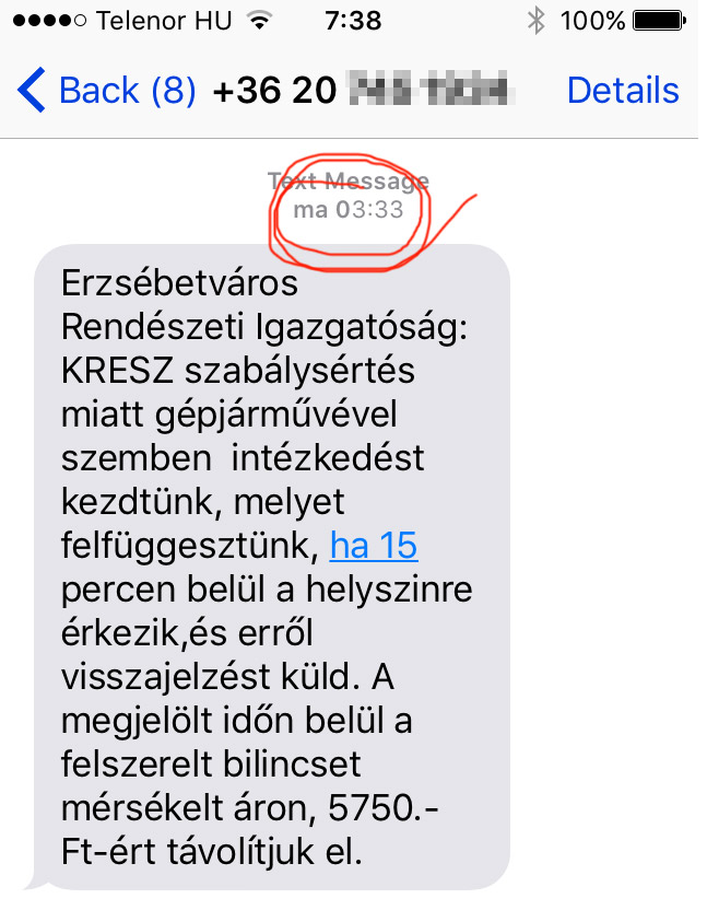 Már évek óta működik az a roppant barátságos rendszer, hogy ha valaki autó átíratásnál megadja a telefonszámát is, akkor ha szabálytalan helyen parkol és kerékbilincset szerelnének az autójára, akkor értesítést kap. Ebben az áll, hogy ha 15 percen belül a helyszínre ér, akkor csak a kedvezményes büntetést, – ízlelgessük még egy kicsit ezt a hülye kifejezést: kedvezményes büntetés – kell fizetnie.