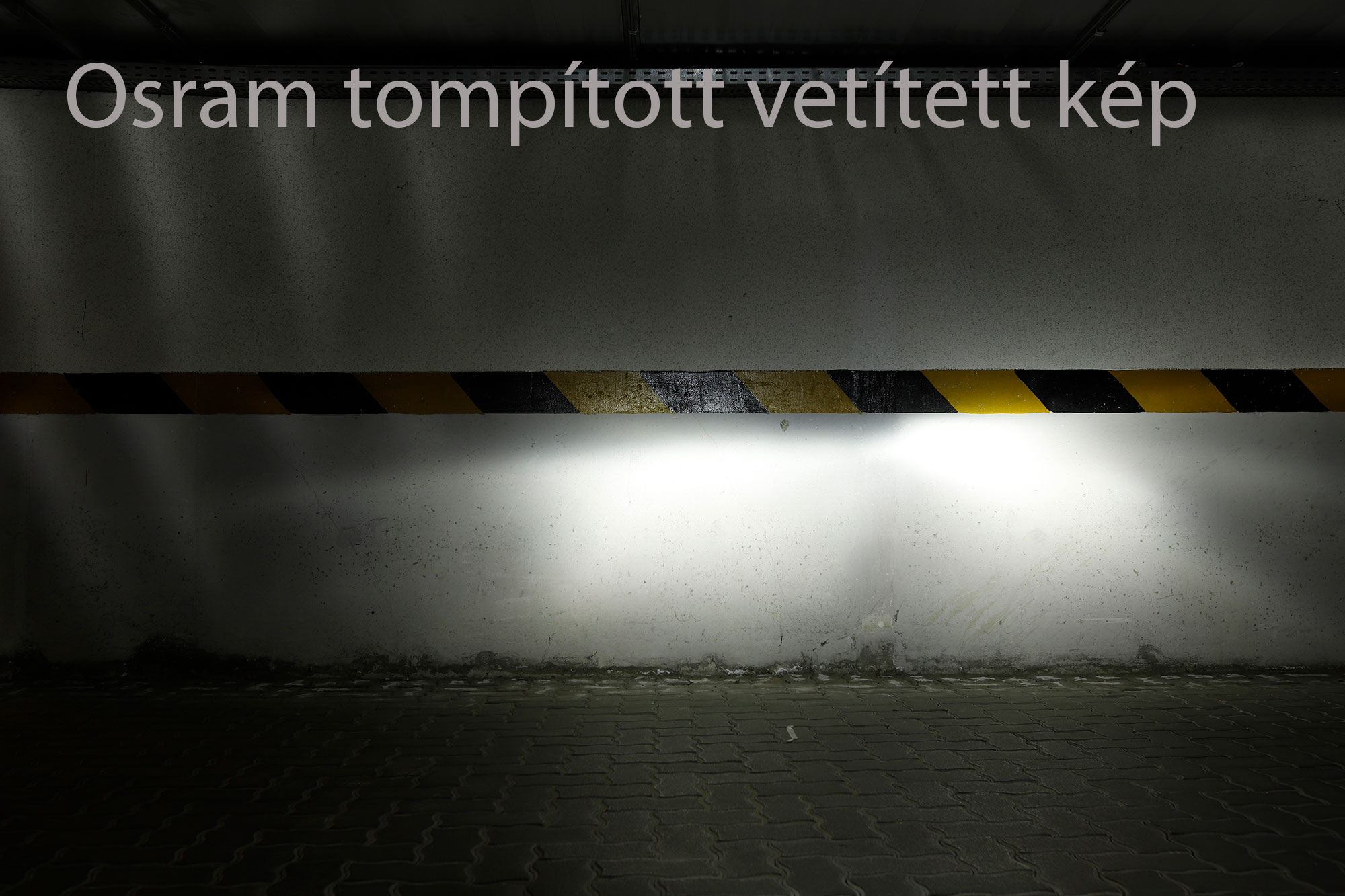 A gyári, ezúttal is Osram-gyártmányú halogénnel kezdtük. Itt a vetített kép legfényesebb pontján 342 luxot mértünk, reflektorral 533 luxot, mindezt 2890 kelvines színhőmérséklet mellett. Az Osram közúton is használható LED-je látványosan több fényt ad, itt tompított fénnyel 1316, reflektort használva pedig 2976 lux volt a mért eredmény ‒ ami tompított fénnyel közel négyszeres, illetve reflektorral öt és félszeres növekedést jelet ‒ az alábbi vetített képekkel: