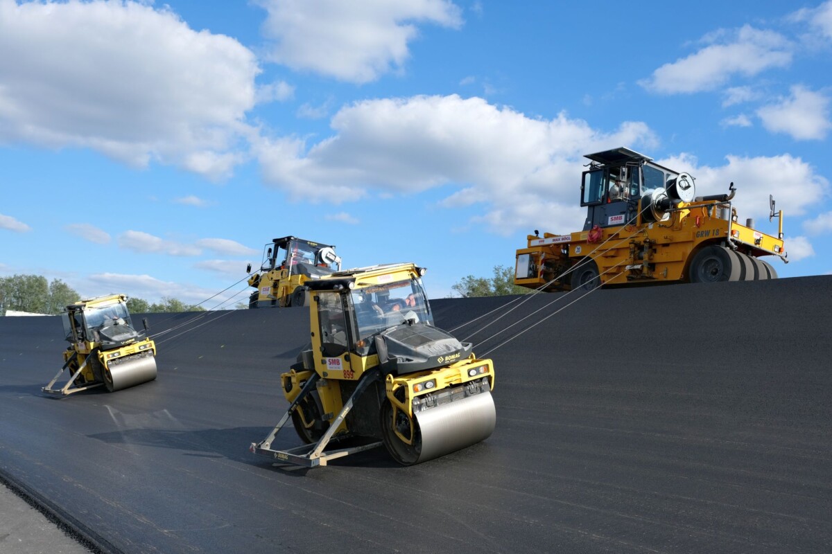 Összesen kettő van a világon az oválpályákat ívben aszfaltozó masinából. A vezérgép tulajdonképpen 15 kis sík aszfaltozó, sorba fűzve. A tízórás műszakokban 800-800 liter gázolajat evett meg a gépsor, plusz némi palackos fűtőgázt