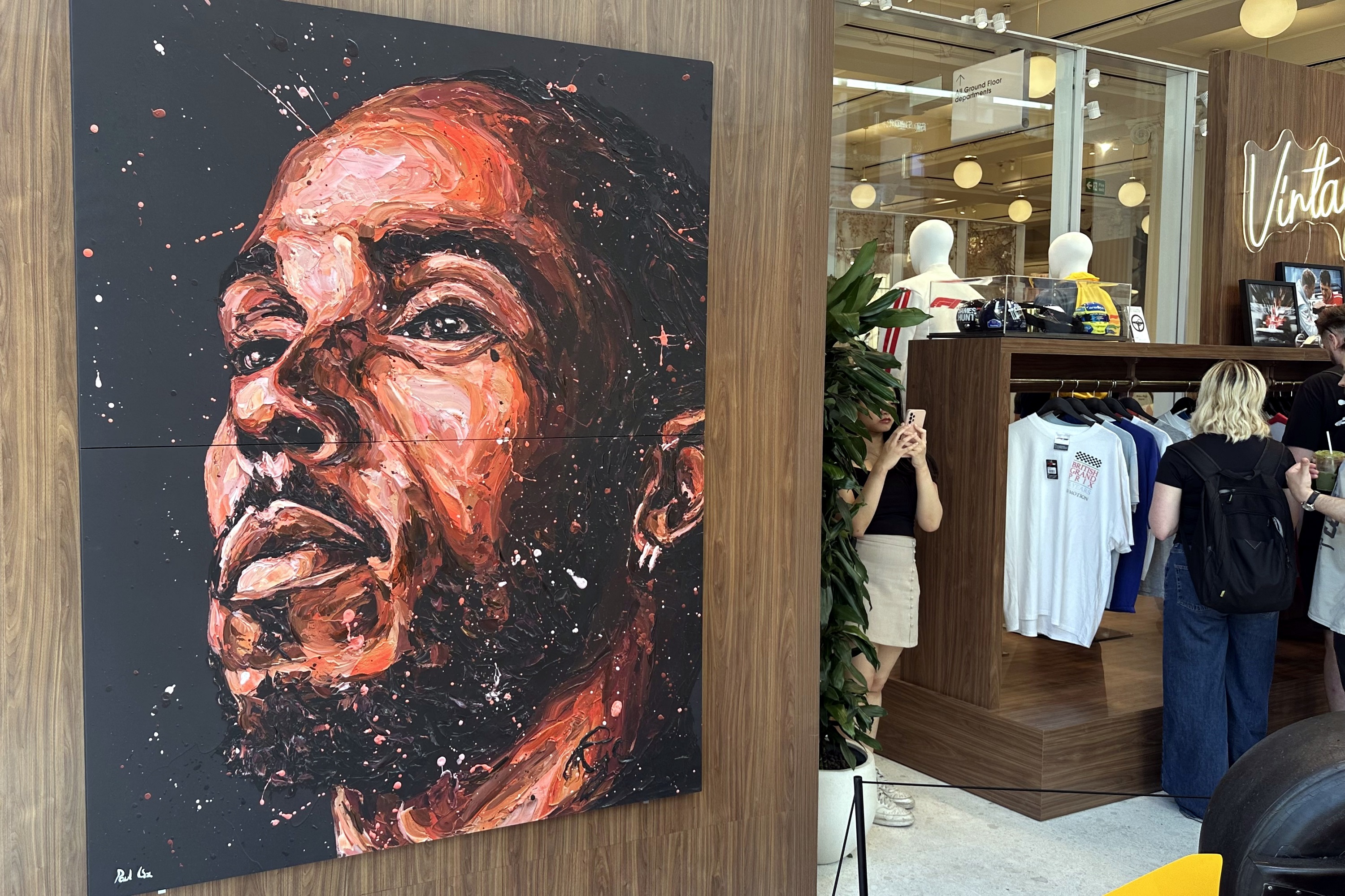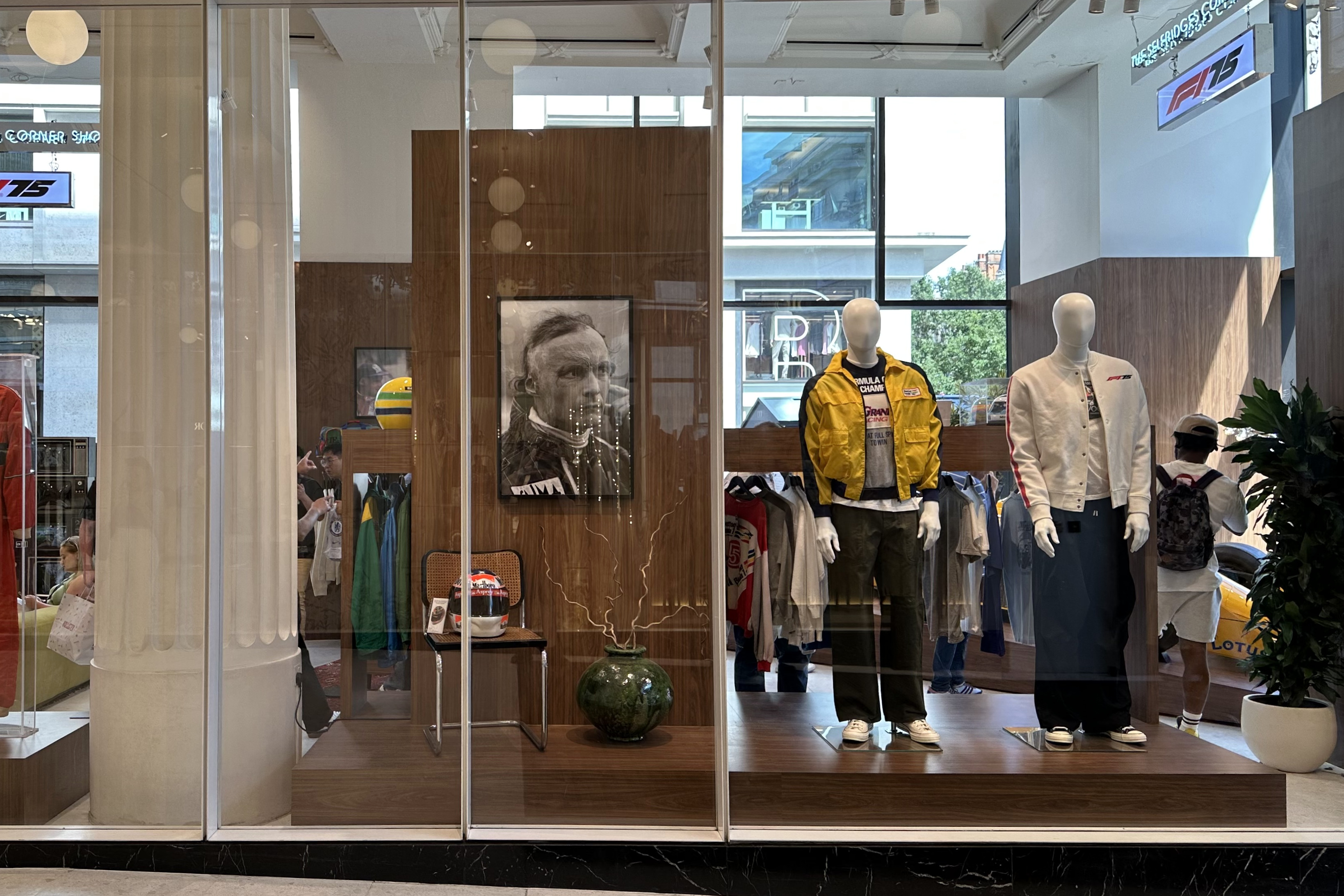 F1 75 Years in Motion, vagyis F1 75 év mozgásban – ez a neve az üzletnek, mely a Selfridges épületének sarkán áll, így a hatalmas ablakokon már kívülről látni, nagyjából mi vár az emberre odabenn. Megnyerő a látvány: Ayrton Senna 1987-es Lotusa, egy hatalmas Lewis Hamilton-festmény, neon Nigel Mansell-portré – csak pár dolog, amit elsőre kiszúr az ember.