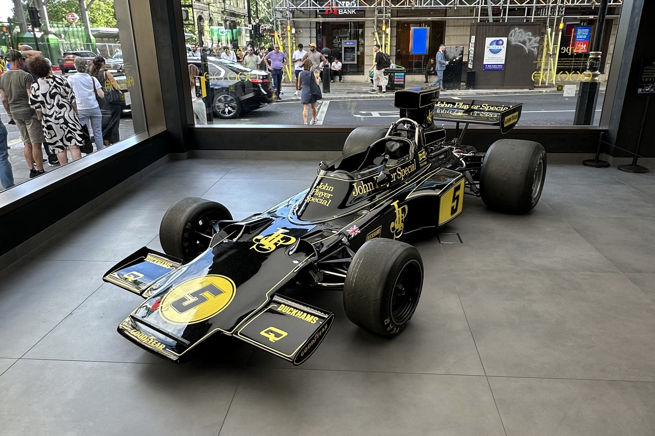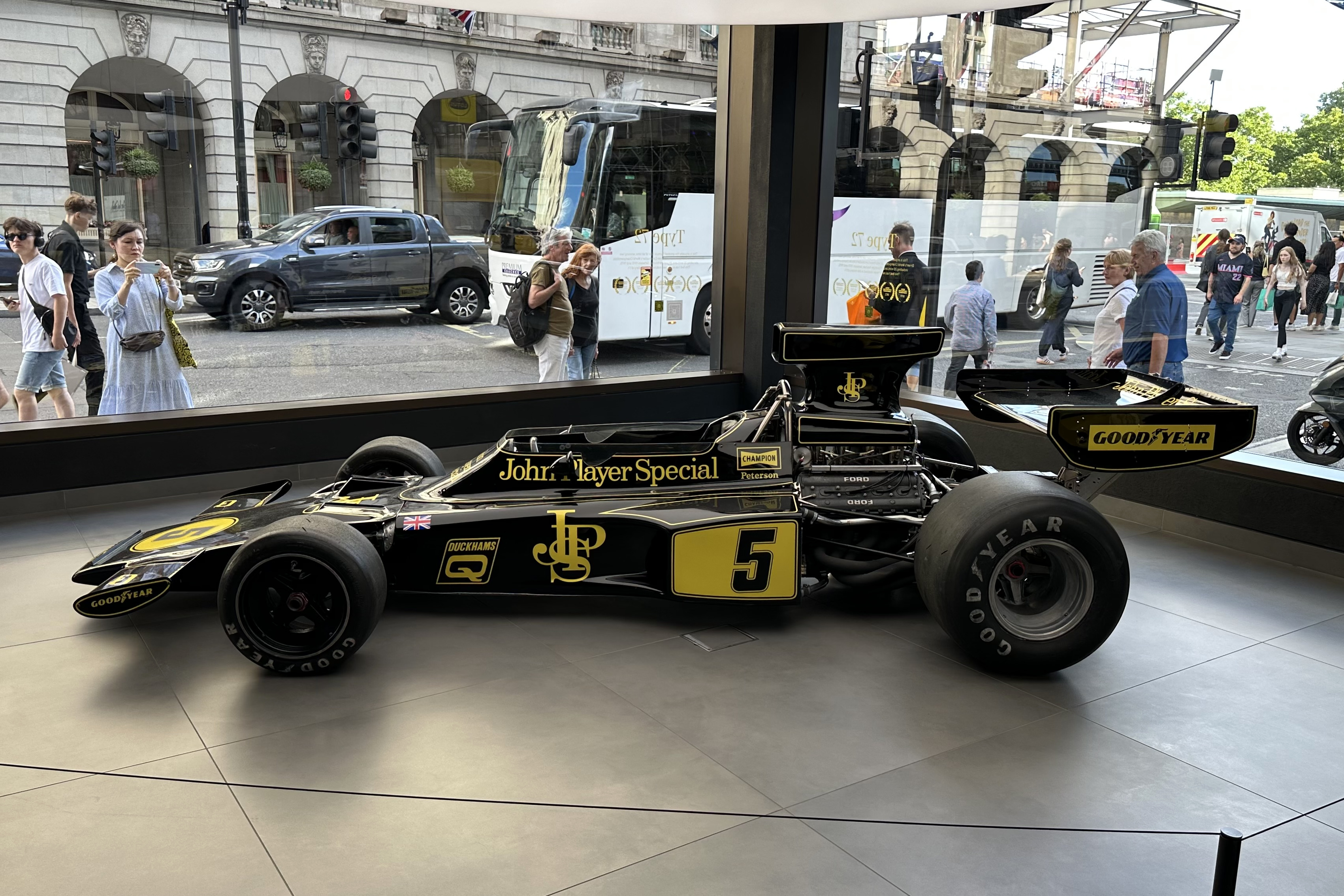 A McLaren partnere, a bőröndöket gyártó Tumi például beöltöztette próbabáját Lando Norris tűzálló ruhájába, az Adidas viszont addig ment, hogy George Russell Mercedesét állította ki üzletében. Hogy a Lotus-szalonban Ronnie Peterson Lotus 72-ese állandó kellék-e vagy sem, azt nem tudjuk, mindenesetre a csúcspontot nálam az jelentette.