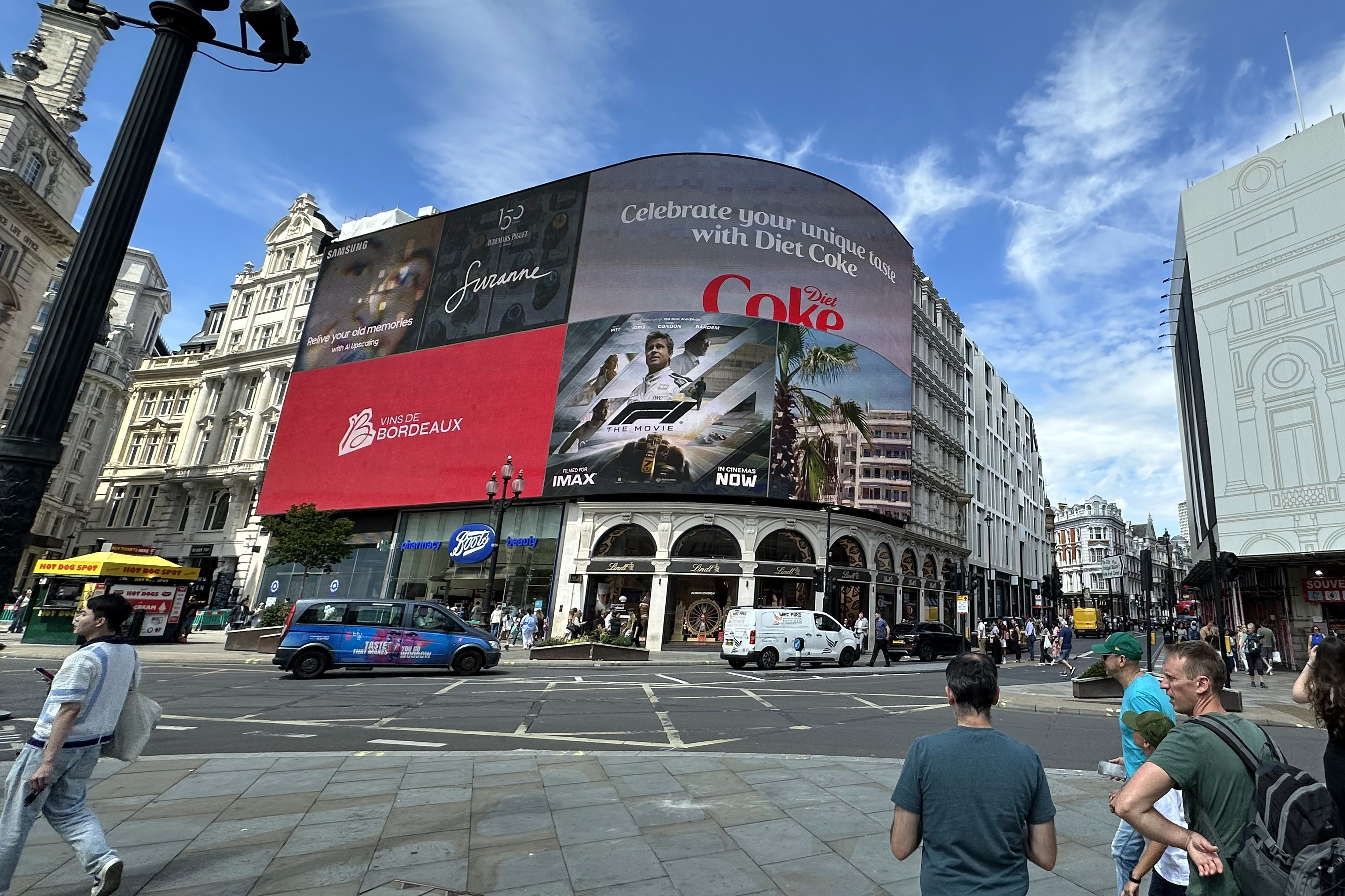 Talán a Brit Nagydíj közelsége is közrejátszott abban, mennyire központi szerepet foglalt el a brit főváros kiemelt részén a Forma-1. Azon meg sem lepődtünk, hogy a Piccadily Circus híres óriáskijelzőin az F1-film promóját adták végtelenszer ismételve. A prémiummárkák üzletei mellett haladva azonban váratlanul nagy volt az F1-dömping.