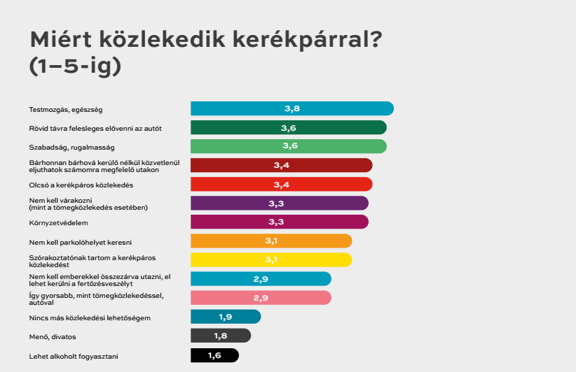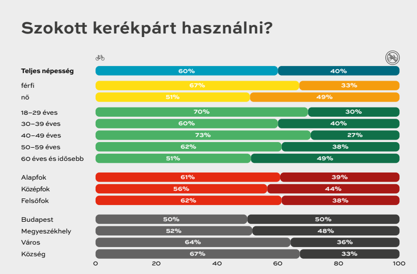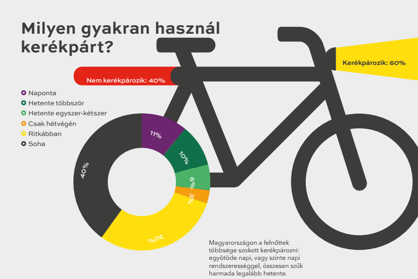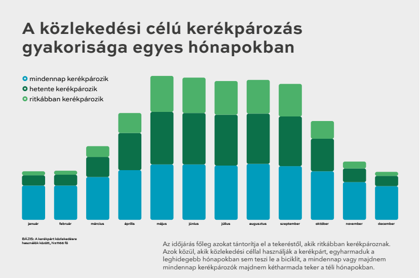 A hazai felnőttek többsége tehát szokott kerékpározni, azonban a népesség majdnem felének az autó az elsődleges közlekedési eszköze, míg a felnőttek egynegyede főleg tömegközlekedési eszközöket használ, amikor közlekedik. Összességében a hazai teljes felnőtt népesség egynegyede legalább hetente egy alkalommal szokott közlekedni kerékpárral, azonban csupán egytizedüknek ez a fő közlekedési eszköze.