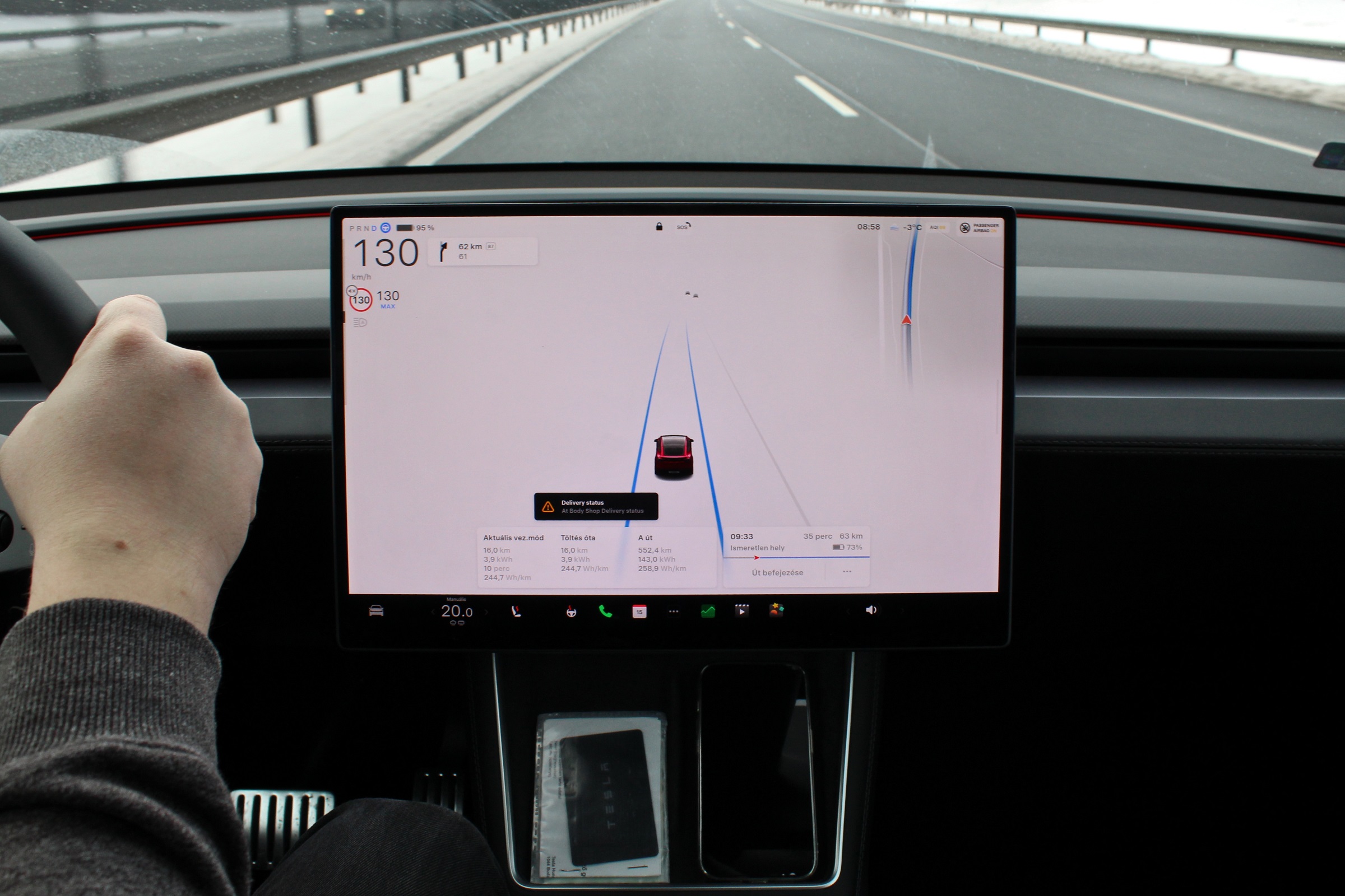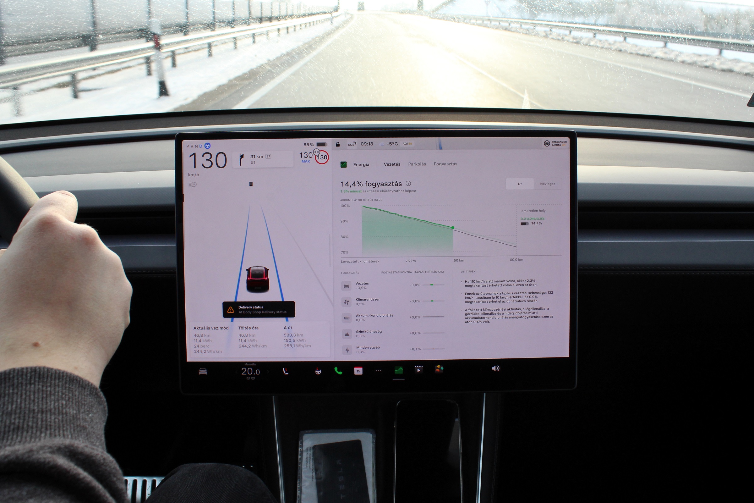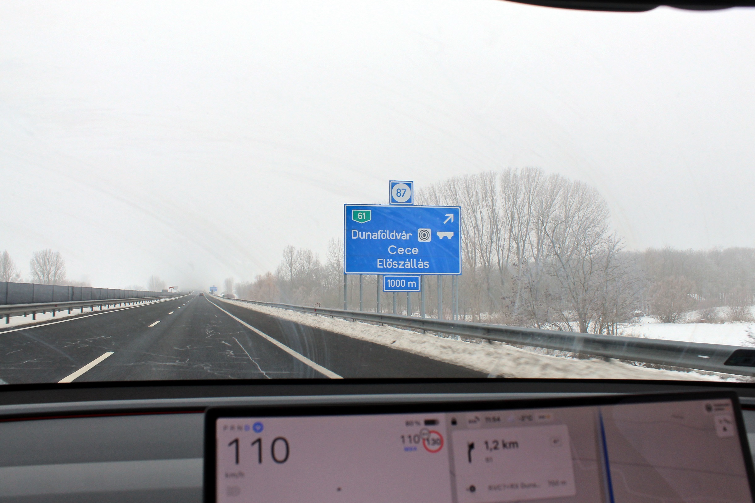 A nagy hidegek ellenére a Model Y-nal mégis bátran hajtottunk fel az autópályákra a tesztidőszak első napjaiban. Közmondásosan jó fogyasztásából az alacsonyan megpihenő higanyszálak időszakában nem sokat érzékeltünk, de a helyzet nem volt olyan rossz, mint amit más autóknál ebben az időszakban tapasztaltunk. A Tesla nagy akkumulátorának köszönhetően pedig nem kellett a hatótáv miatt sem parázni.