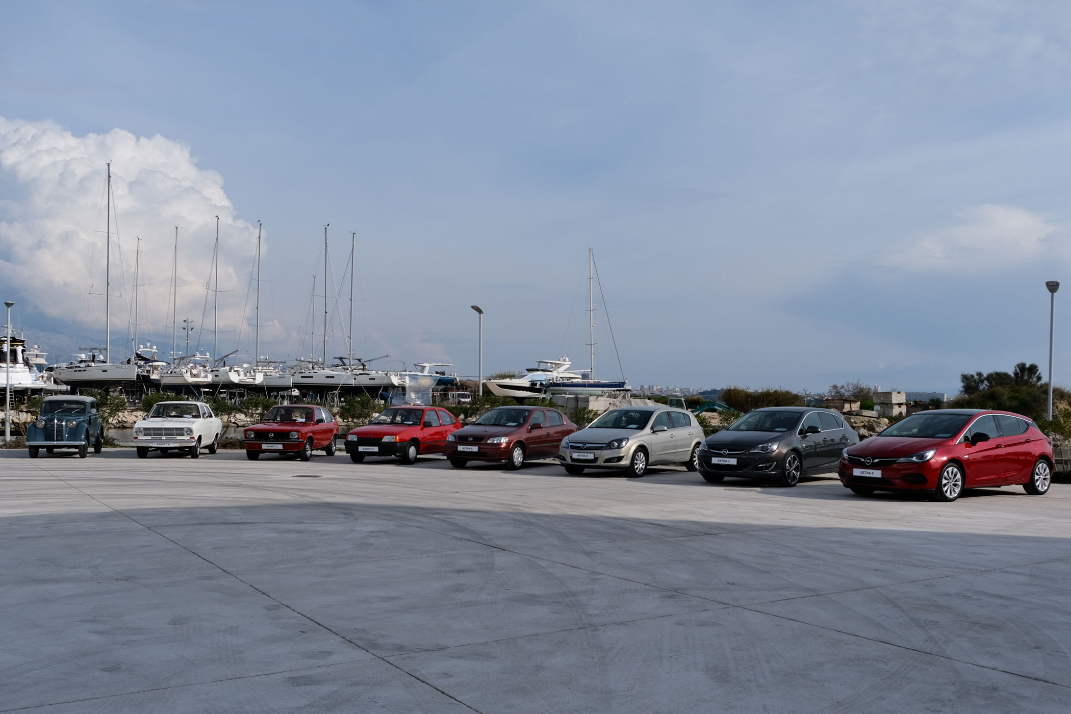 1936 óta készülnek kompakt Opelek, nem mindegyik fért el a téren. A fotón bal szélen az első Kadett, jobb szélen egy K Astra
