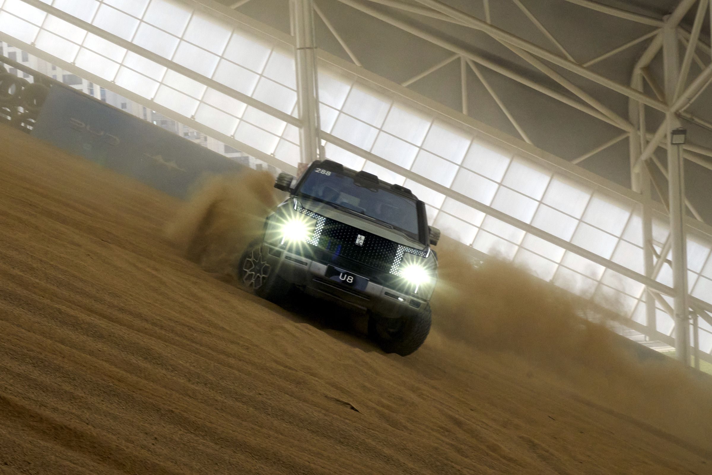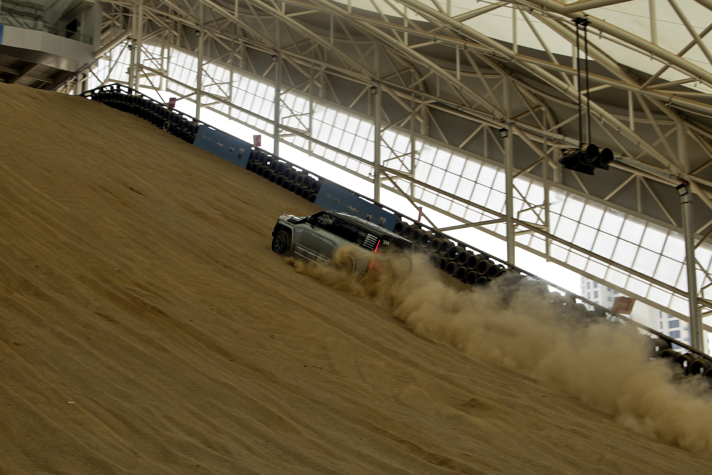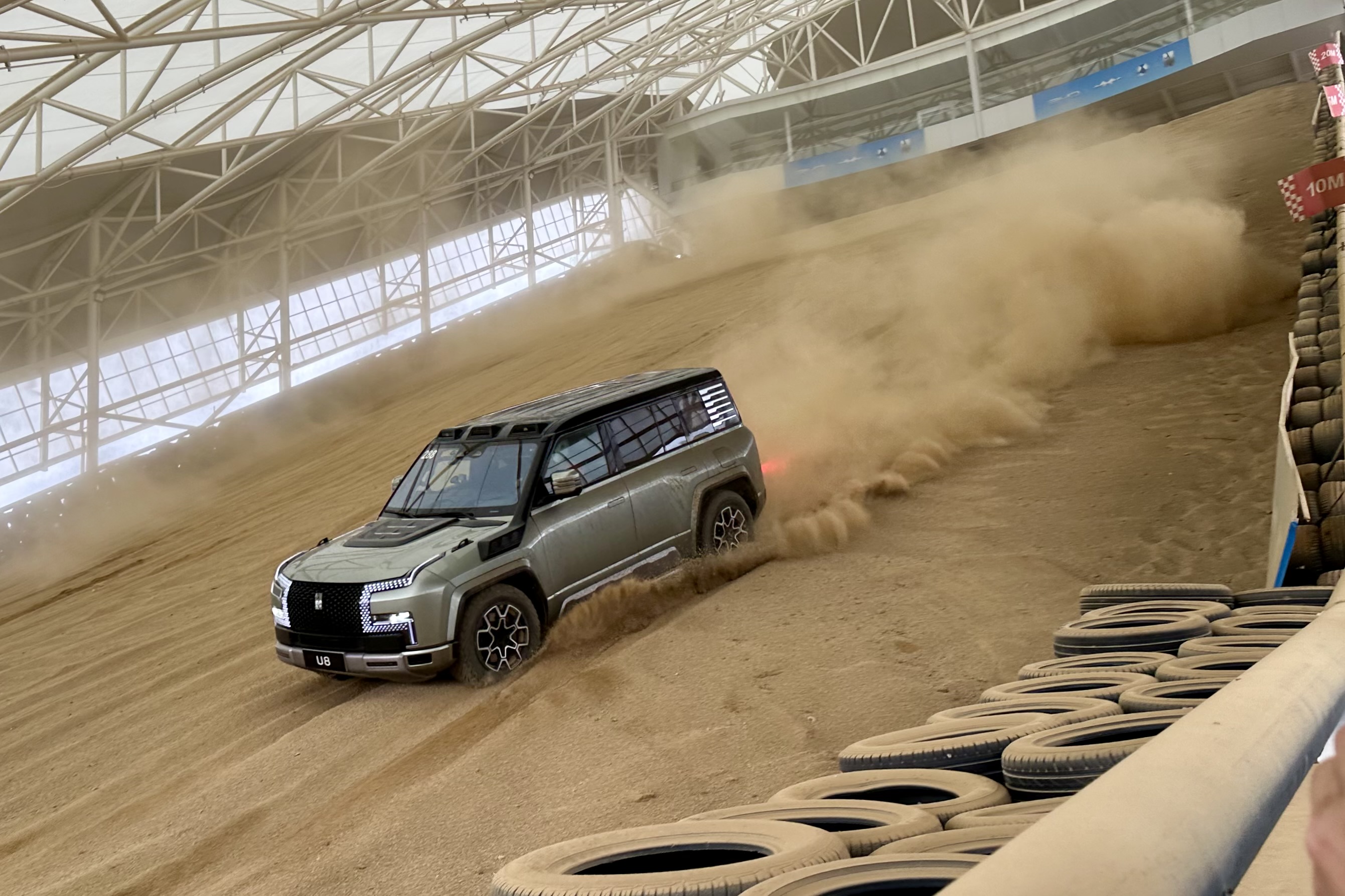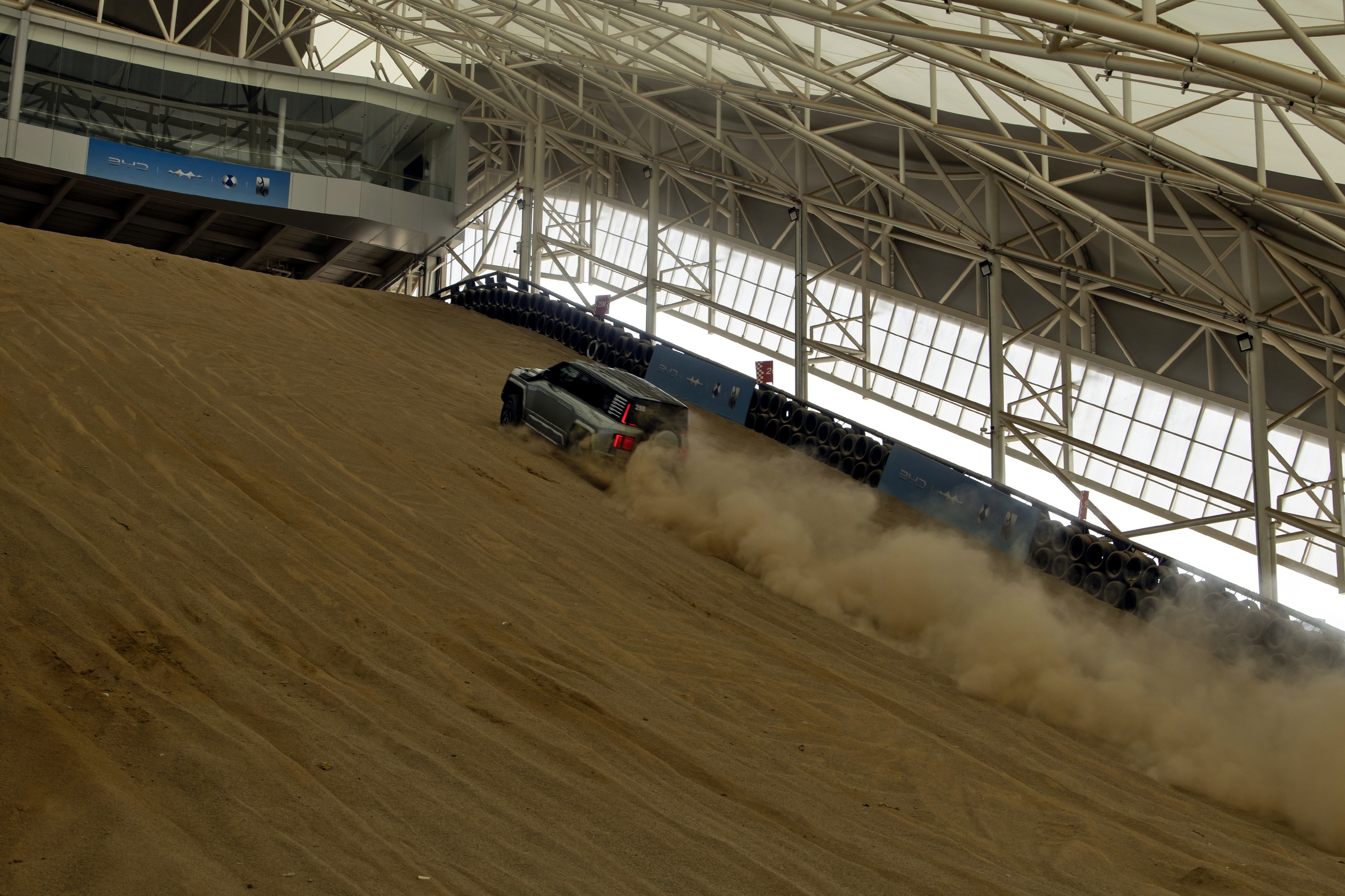 A tesztpályán felhúzott, tetővel fedett homokdűne valódi sivatagi homokból készült, Belső-Mongóliából hozattak több mint 6000 tonnányit. Ez száz vasúti vagonban férne el. A pályát egy méter vastagon terítették be vele, az alaptól a 28 méter magas tetőpontig, melyeket egy 28 fokos lejtő köt össze. Szédítő látvány, a négy (kerekenként egy) villanymotorral szerelt, három híján összesen 1200 lóerős U8 azonban játszi könnyedséggel szaladt fel rá profi kezek közt.