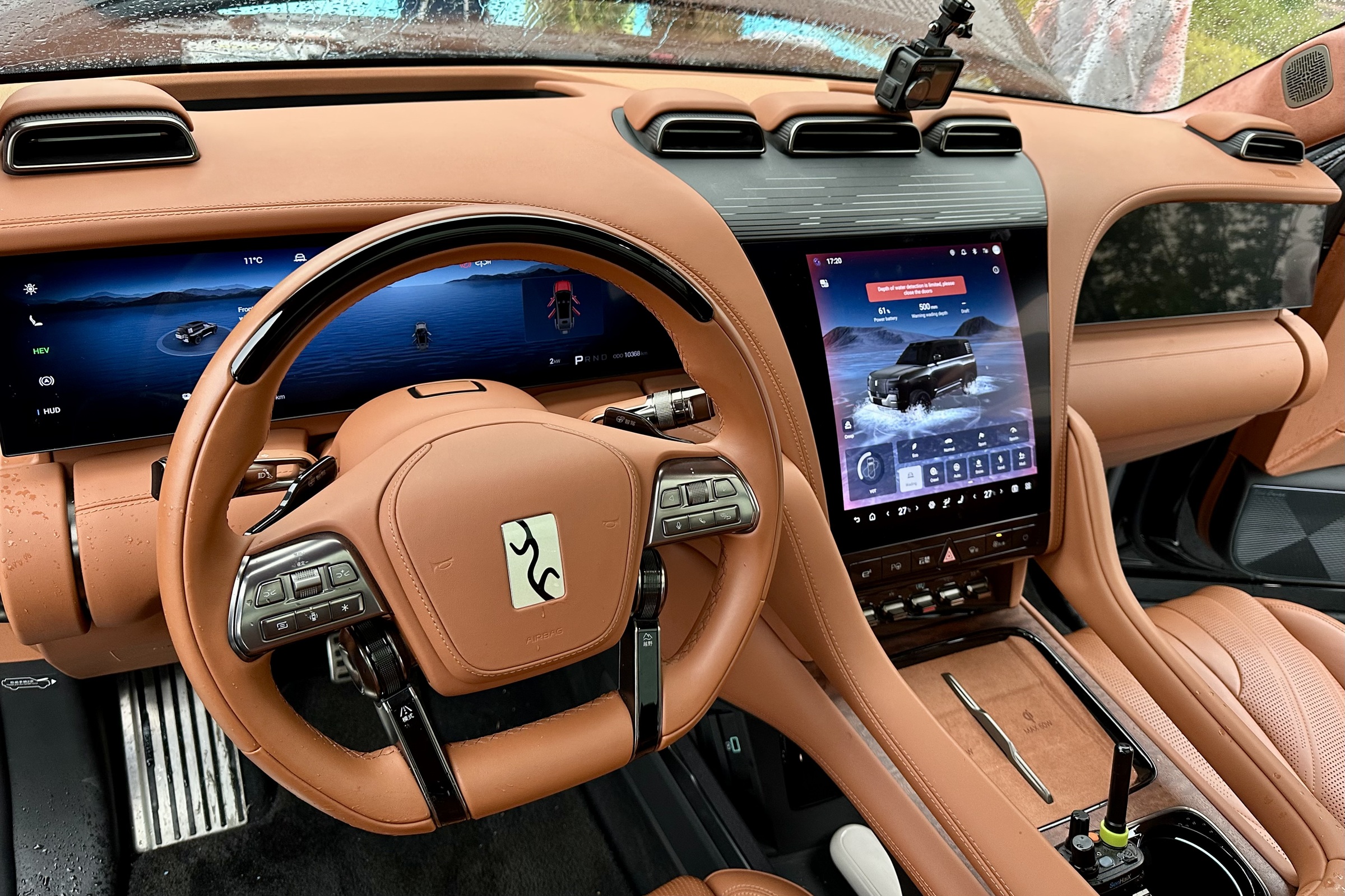 Noha nehéz az autó, a Yangwang U8 mégis lebeg, sőt, már-már hajóként haladhatunk vele a vízfelszínen. Ez addig tart, míg van töltés a 49 kWh-s akkumulátorban (vagy legfeljebb fél óráig). Az autó belsejét egyébként úgy csatornázták be, hogy a befolyó víz tömege kicsit előredöntse a járművet, így biztosítva, hogy a sofőr mindig kilásson. Elsőre, de talán még másodikra is hülyeségnek tűnhet ez a funkció, de látva az egész nap szakadó esőt, valamint ismerve, hogy a világ ezen részein elő-előfordulnak villámárvizek, a dolog mégsem hangzik annyira elborultnak.