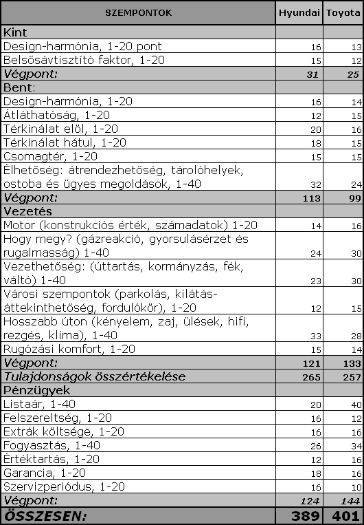 Feje tetejére állt a világ: a két limuzin közül az i40 valamivel jobb autó, de az értékelésben szerzett pontelőnyét a Toyota messze kompenzálta alacsonyabb fogyasztásával, jobb értéktartásával és főleg sokkal kedvezőbb listaárával.