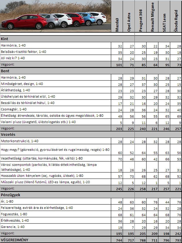 Mivel az Astra komfortját, a Rapid praktikusságát, a Mégane árát, a 308 igényességét, a Leon fejlettségét és a Mazda varázsát nem lehet egy autóban hazavinni, muszáj választani. Az autók színvonala alapján a mezőny két részre szakad.