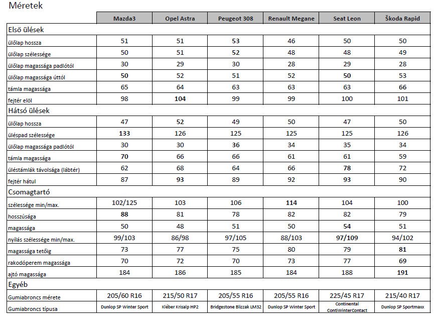 Ezúttal is az Autó és Stílus magazin munkatársaival közösen végeztük a tesztet. A belső téri méreteket megtaláljátok a táblázatban, a lényeg az, hogy négy átlagos termetű ember mind a hat autóban jól elfér, nálunk viszont egyetlen középtermetű tesztelőre három másik jutott 190-194 centi közötti magassággal.