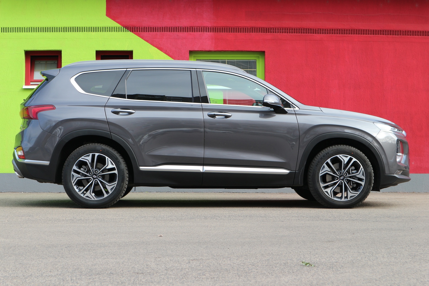 A sötétített hátsó ablakokkal és a divatos formájú, fekete-fém kontrasztokkal játszó nagy, 19-es felnikkel komoly, méltóságteljes, nagyautós eleganciával vonul a forgalomban a Santa Fe. És az a legjobb ebben a hatásban, hogy akkor sem omlik össze, amikor megáll a kocsi és feltárul az ajtaja.