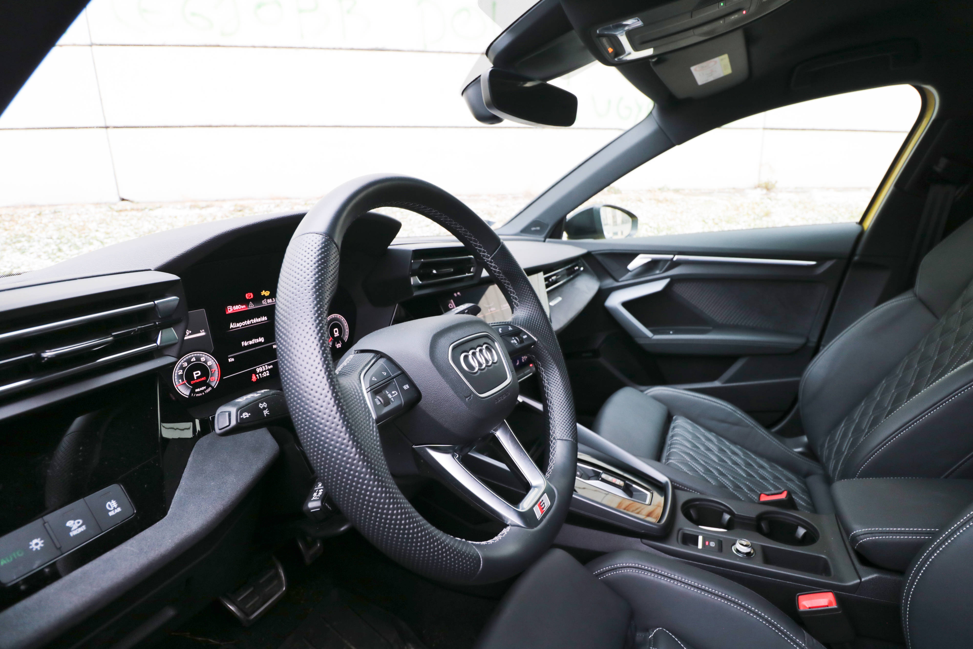 A perforált bőrrel borított kormány klasszikus, mérete ideális, a hagyományos gombok kellemes kattanással, jól működnek. Igazi sportos részlet a műszerfal puha, alcantaraszerű borítása. A kiemelkedő anyagminőség a láb vonaláig tart, azért az A3 hagy valamit a felsőbb osztályoknak is, mert itt már nincs puha borítás, és az ajtózsebek egyszerű, kemény műanyagból készültek.