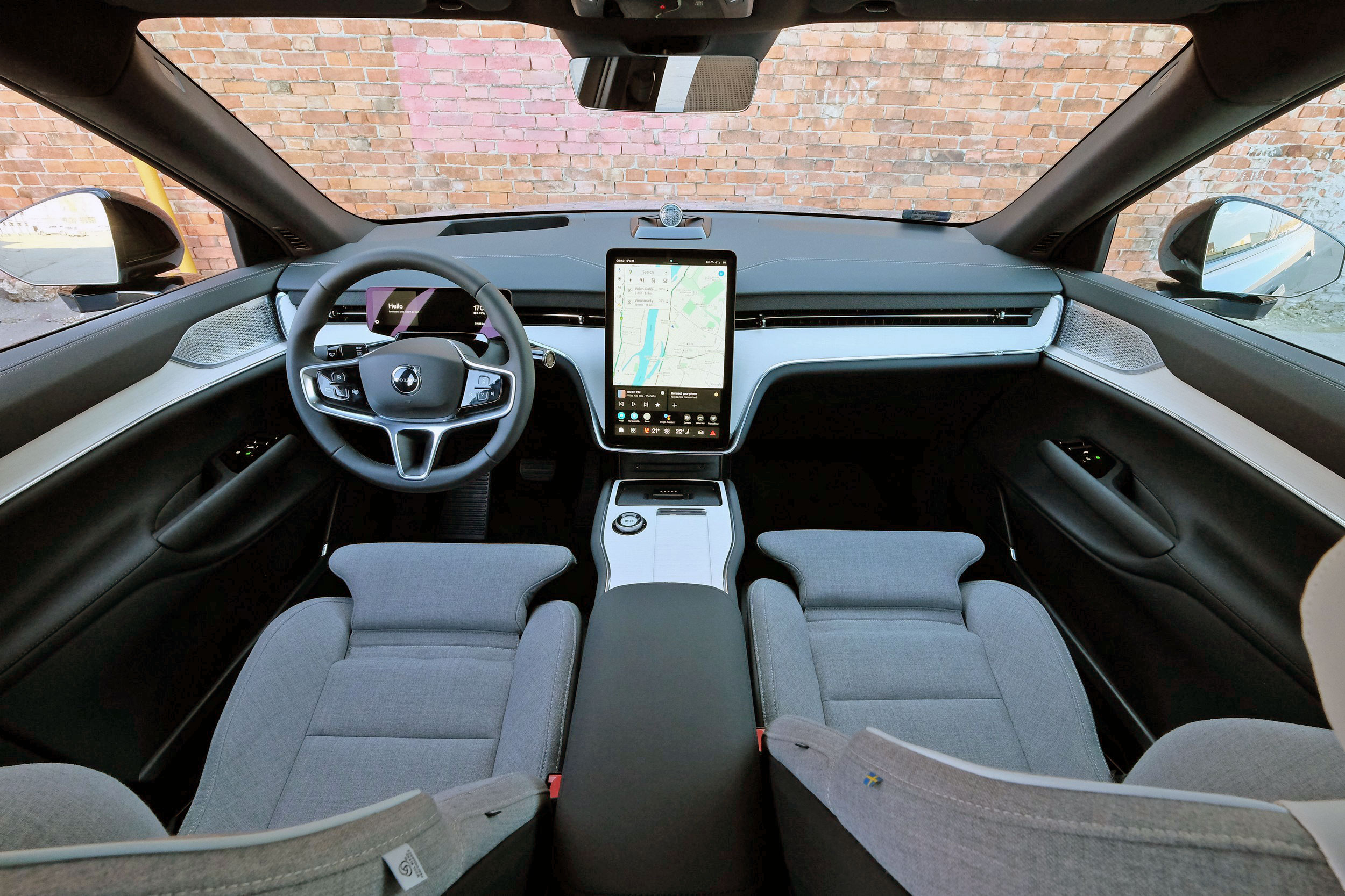 Rengeteg apróságnak lehet helyet találni az ajtózsebben, könyöklőben, a középkonzol alján, találunk benne pohártartót, fedett rekeszt és a duplafenekű üreget a könyöklőben. Középen gigászi, 14,5 hüvelykes, függőleges tájolású monitor uralja a panorámát, és van egy másik szerényebb meretű műszerfalként funkcionáló képernyő is, rögtön a fűthető, jó tapintású kormány mögött. Utóbbin a lidar által felismert autók képét, a térképet, vagy hagyományos módon a sebességet és egyéb kiegészítő információkat lehet figyelemmel kísérni.