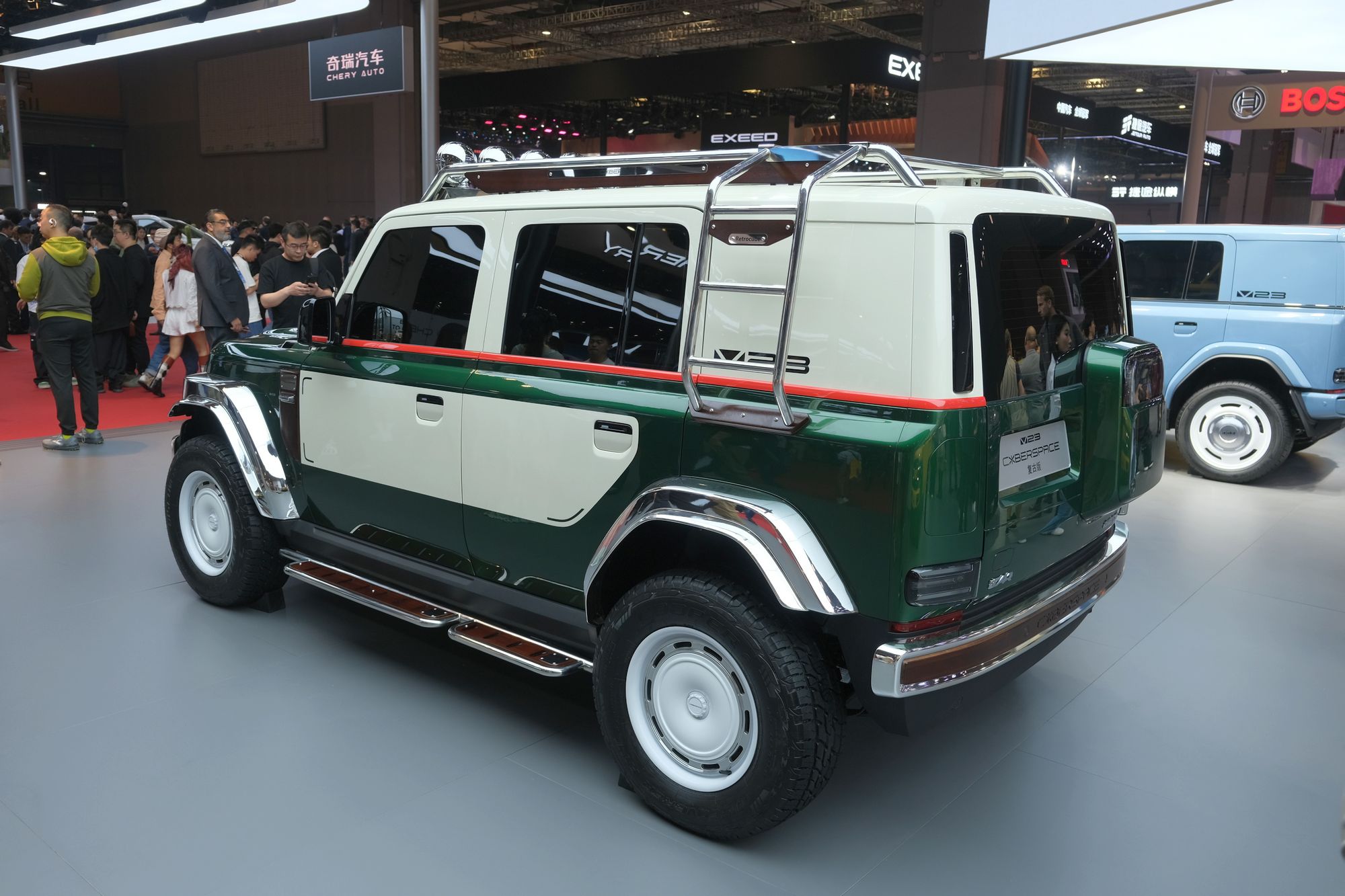 Az elképzelhető legtradicionálisabb terepjáróarc kerek lámpatesteiből szögletes LED-sorok fénye ragyog elő. Az ajtólemezbe nyomott nagy horpaszokban a mai villanyautós trendeknek megfelelően nehézkesen kezelhető, de legalább vicces kilincsek fészkelnek. A V23 frontjának sziluettje a legkülönbözőbb helyeken bukkan fel húsvéti tojásként (ezt a játékot a Jeeptől tanulta a Chery). Az oldalra nyíló raktérajtón is van egy klasszikus dizájnelem, de a dudor alatt nincs se pótkerék, se üzemanyag-kanna (aminek nem is lenne sok értelme, ugye), csak egy zárható tárolórekesz, ami remek hely a töltőkábeleknek.