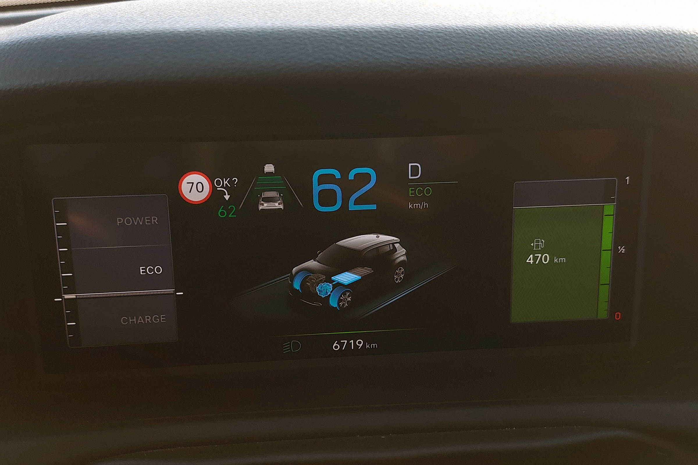 Ami szép, az a digitális óracsoport rajza, a hibrid hajtás működésének grafikája is tetszett. Kár, hogy a kijelzőn megjelenő autó fekete, nem követi az autó tényleges fényezését, amit egy Renault Zoé 2020-tól tudott a nagy modellfrissítéssel, hogy ne a BMW autóival példálózzak.