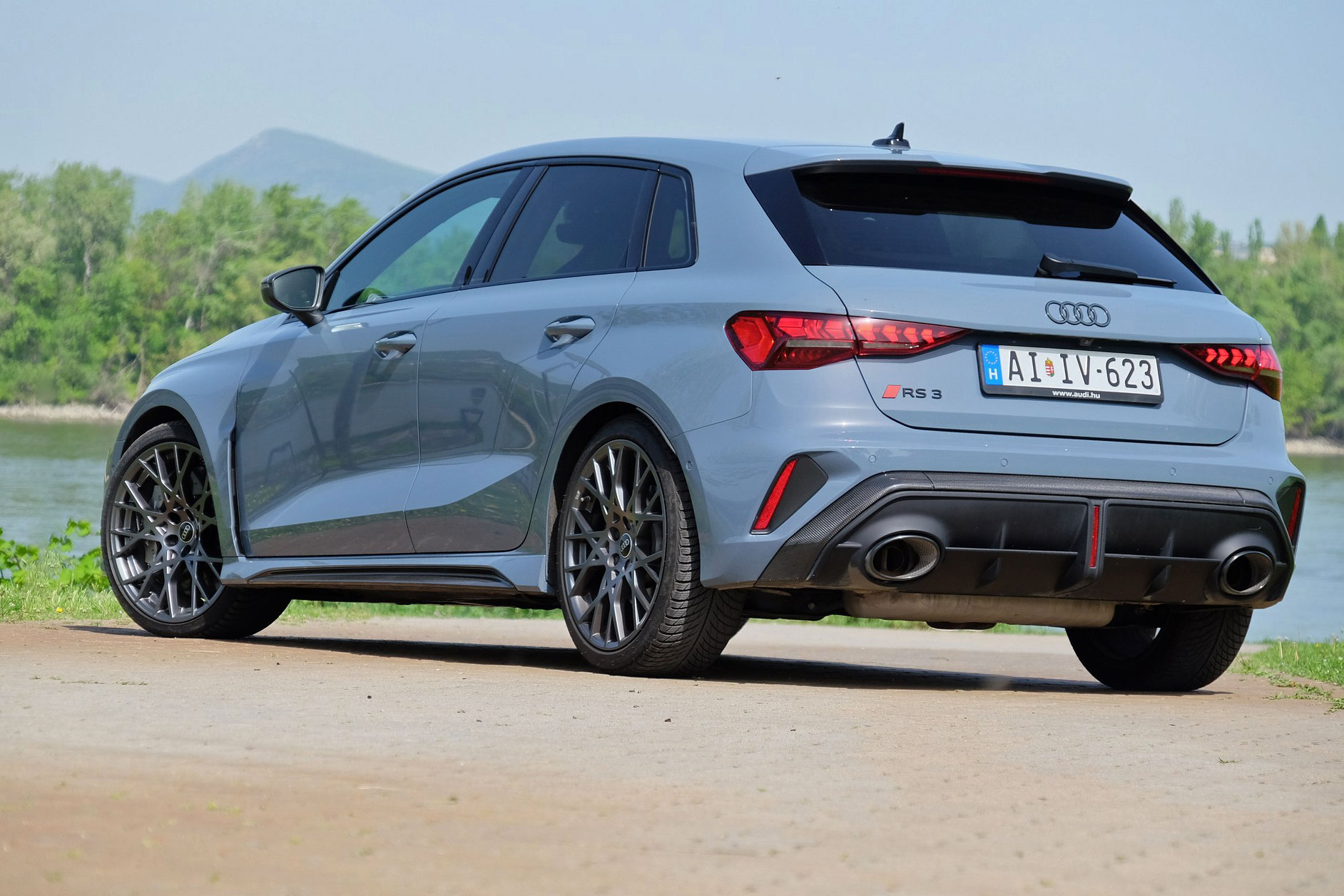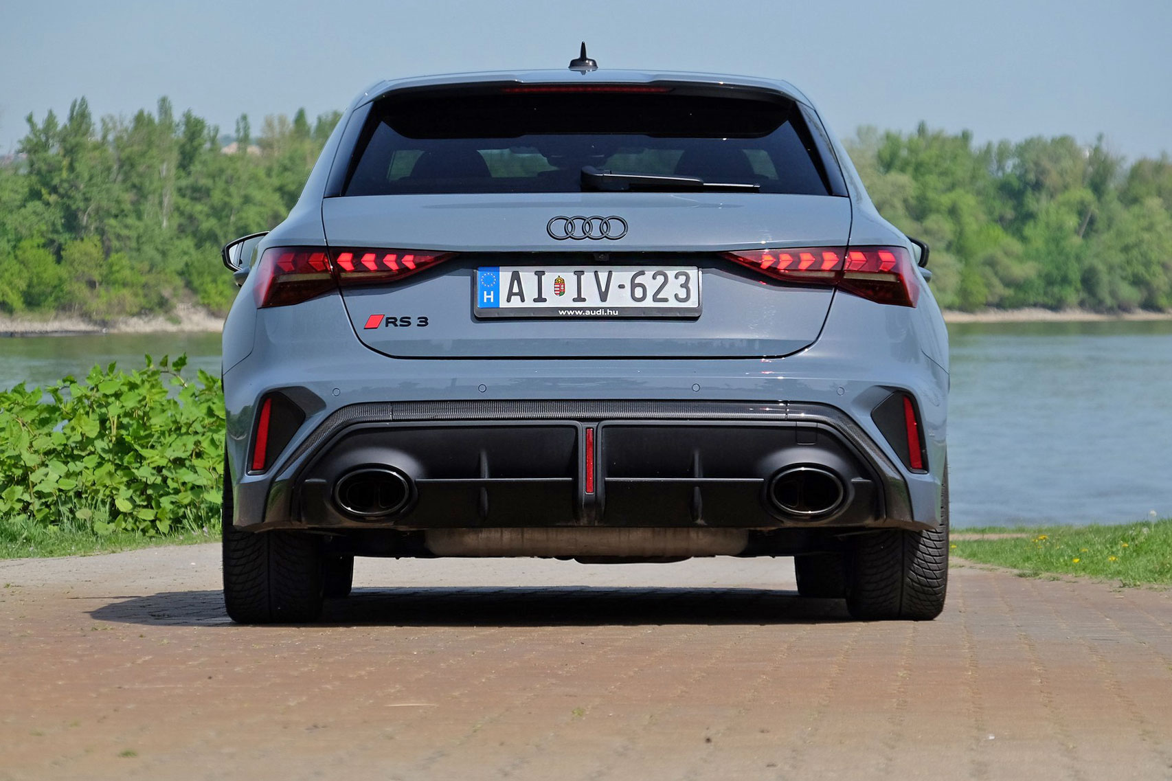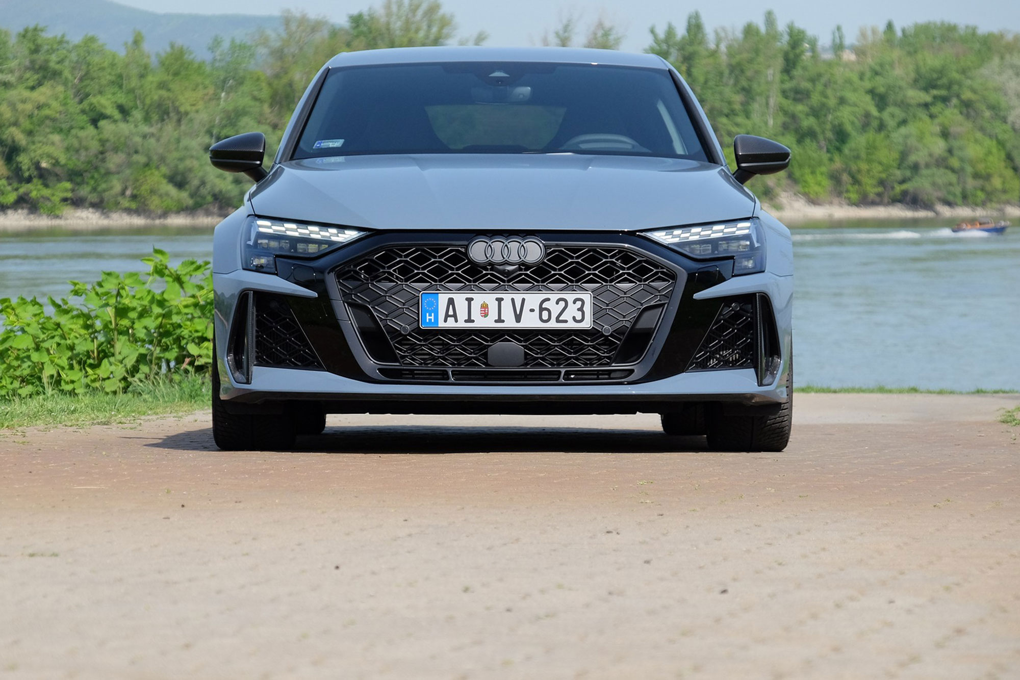 Ránézésre szétveti az erő az Audi RS 3 testét. A széria A3-nál valamivel szélesebb, lapos, mérges autó amúgy egy átlagos, kompakt méretű ötajtósnak tűnne, ha nem lennének rajta légterelők, karbon kiegészítők, látványos felnik – amik mögött hatalmas féknyereg és kerámia tárcsa sejlik fel – és két óriási, ovális üreg mögül hörgő kipufogó. Az krómmentes márkaemblémával díszített orron a kockás zászlót idéző mintájú LED-es nappalifény jó poén, és szintén jó húzás, hogy csupán egyetlen RS embléma került az autóra, az is hátra.