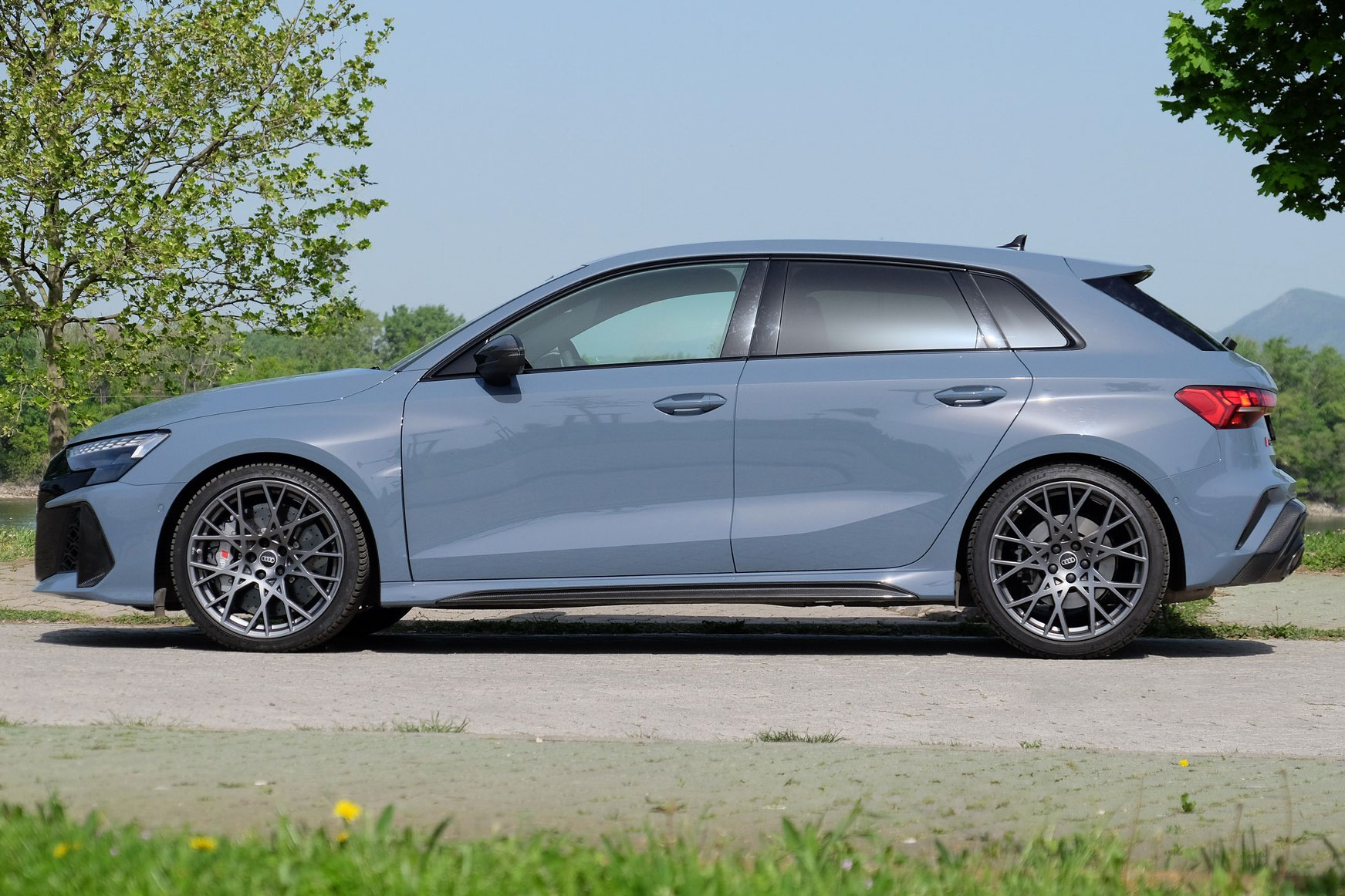 Ennél az autónál a légbeömlők, illetve a hátsó diffúzor nem csupán látványelem, hanem valódi funkciója van itt minden résnek, nyílásnak. Elől a légbeömlők mögött hatalmas hűtők láthatók, és megy levegő a kerekek felé is. Az autó hossza 4381 milliméter, szélessége 1851 mm, – a “csak” 310 lóerős S3 szélessége 1816 mm – magassága 1436 mm, a tengelytávolság 2631 milliméteres, amivel nagyjából a VW Golf ligájában látszik, nincs 10 centi különbség sem az RS 3 javára.