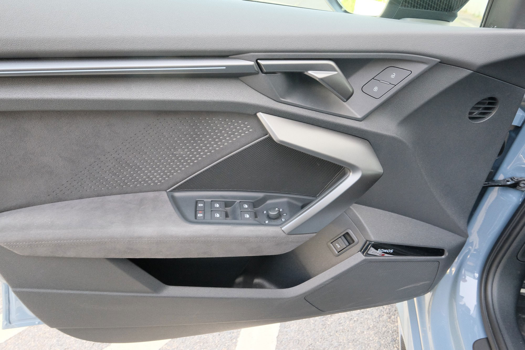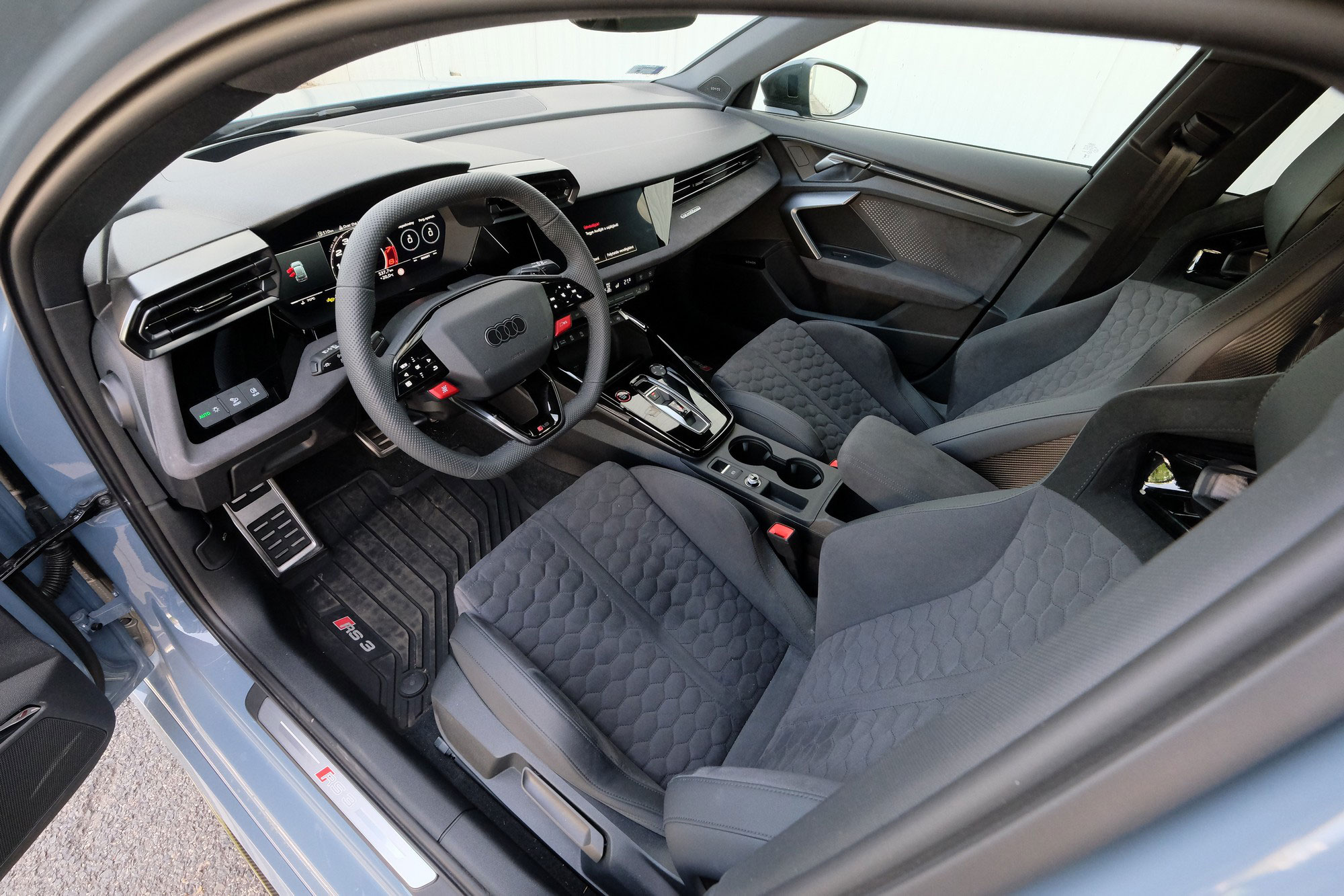 Kicsit lejjebb további szerencsés funkciók gombjai, kapcsolói találhatók, amelyek mind megérdemlik, hogy saját, közvetlen gombjuk legyen, ne menüből kelljen ezeket aktiválni. De nem ez a lényeg, mert aki benéz, vagy beül egy RS 3-ba, az amúgy is a karbon vázba épített, kézzel állítható, integrált fejtámlás, egyáltalán nem spártai keménységű sportüléseket, a háromküllős, alul felül kissé lapított sportkormányt és a fém pedálokat látja. A sportos hangulat már a motor indítása nélkül is átjön, és az utasérben elszórt számtalan RS felirat sem hagyja, hogy elfelejtsd, miben is ülsz.