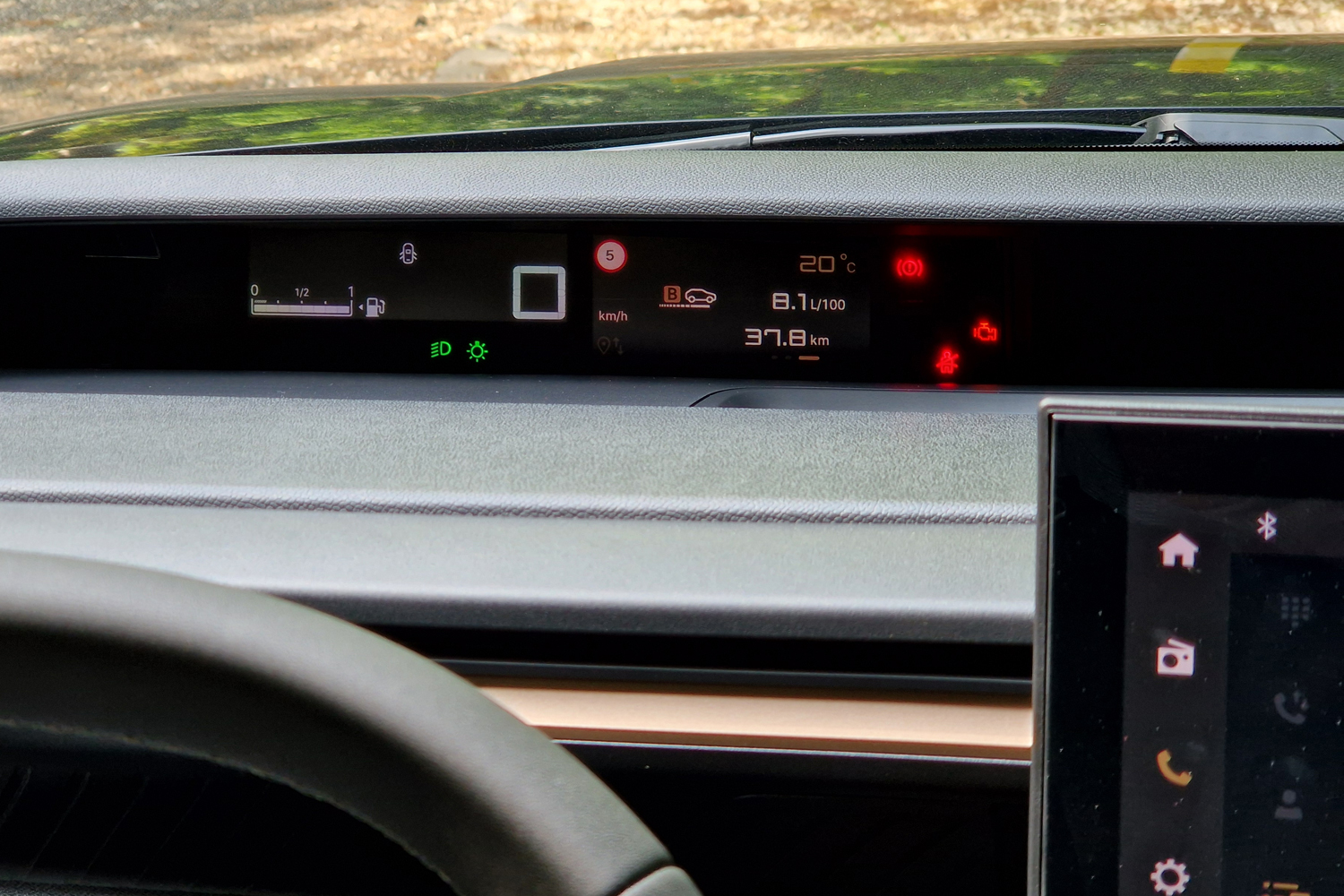 Árnyékolt head-up display-nek hívja a Citroën a szélvédő alatt futó TFT-kijelzőt, amely a vezető számára nyújt információkat. Jó név, de azért nem olyan, mint az út fölé vetített képek, de valóban távolabbinak tűnnek a számok, mint egy sima műszerfal esetén. Alapesetben csupán telefontartó jár az autóhoz, a jobban felszerelt változatokban jelenik meg középen a fedélzeti rendszerhez tartozó 10,25 colos érintőképernyő. Előbbi esetében alkalmazásokon keresztül érhető el a rádió vagy a navigáció, és a kormányról vagy hangvezérléssel is működtetheti a funkciót.