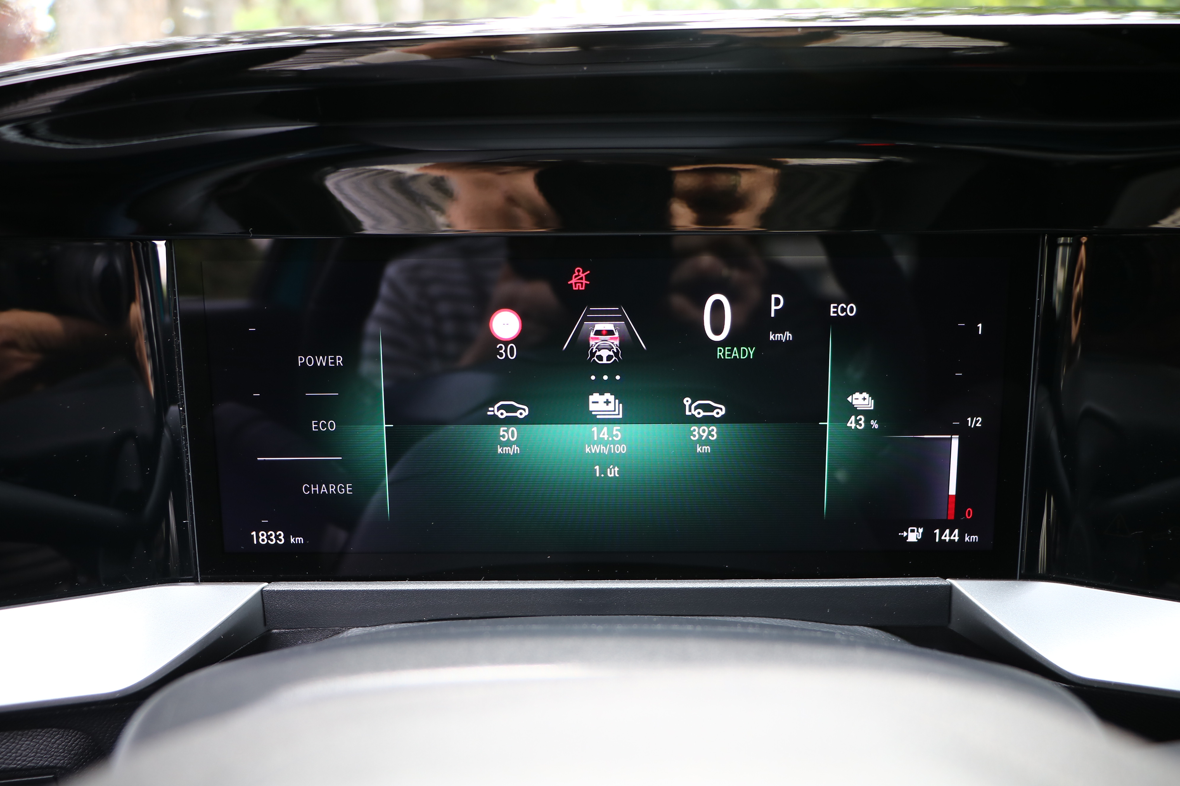 A városból kiérve az egész hatékony zajszigetelés tűnik fel, a vezetéssegítő rendszerek pedig határozottan de alig észrevehetően teszik a dolgukat. Nem agresszívan, feltűnő módon akarnak határok közé terelni. A végsebesség 150 km/óra, ami messze elmarad a benzinesek mögött, és azért 130 km/óra környékén már 20 KWh/100 km felé ugrik a fogyasztás, tehát amúgy sem érdemes forszírozni ezt a tempót különben villámtöltő után kell néznünk.