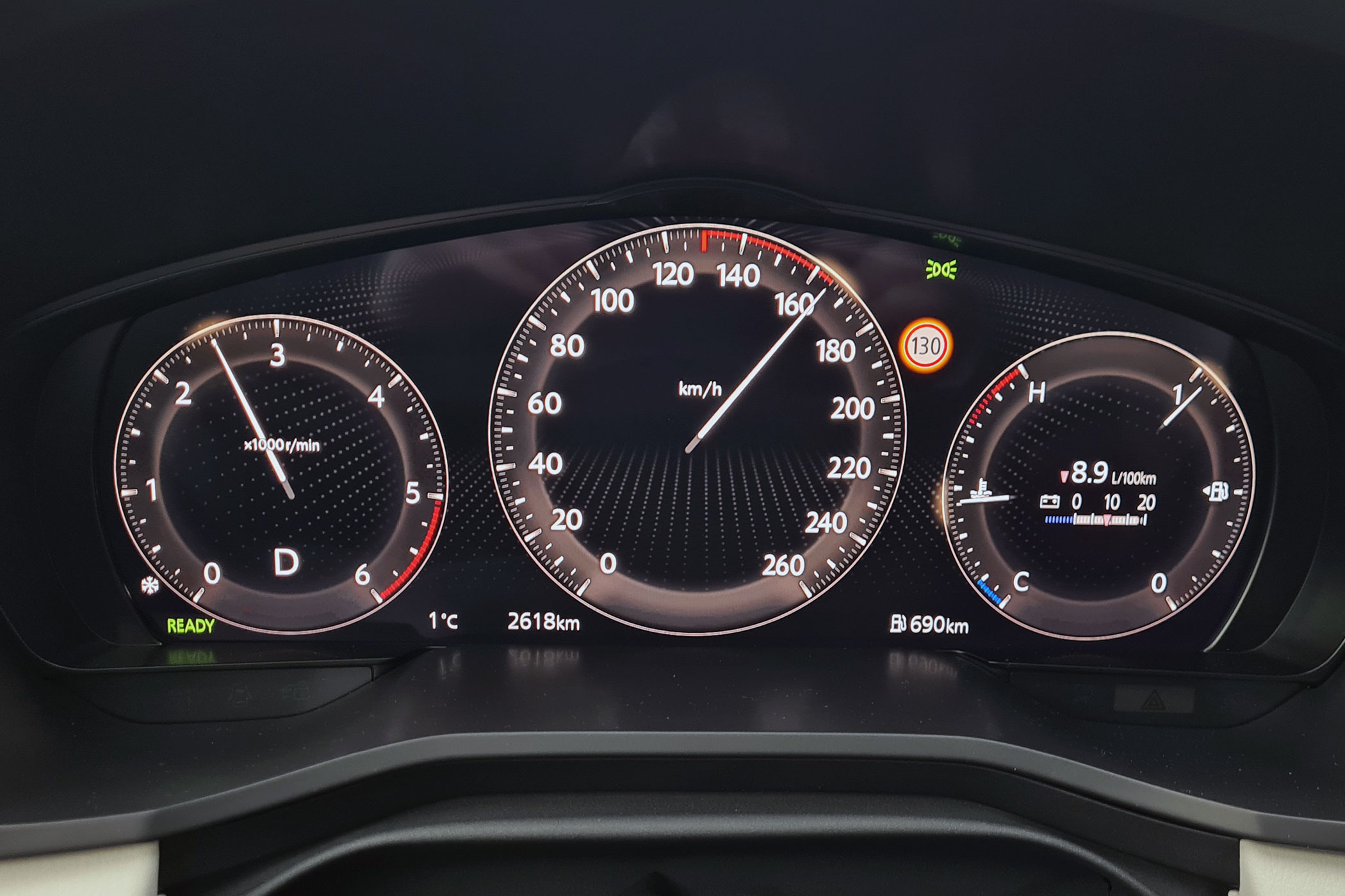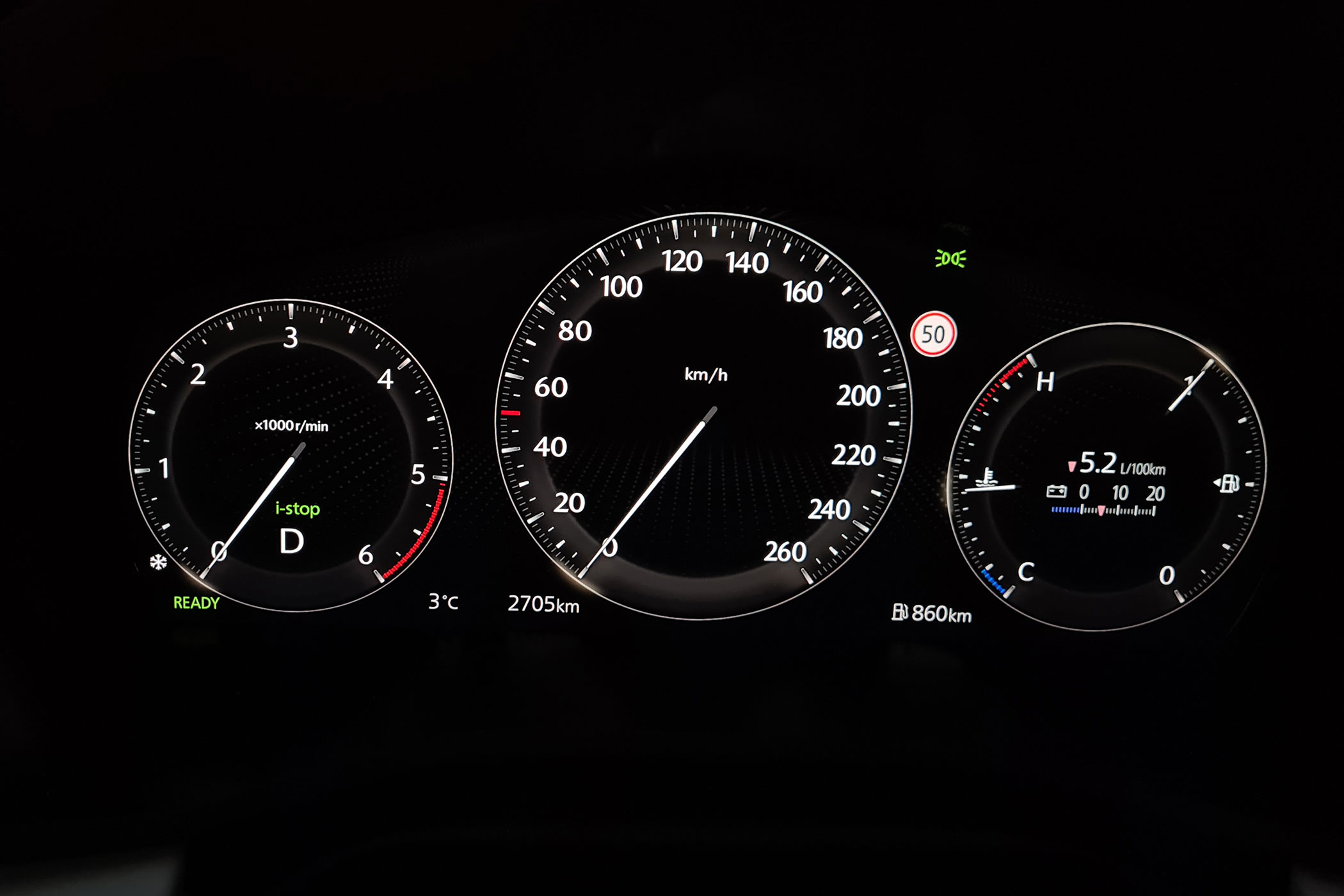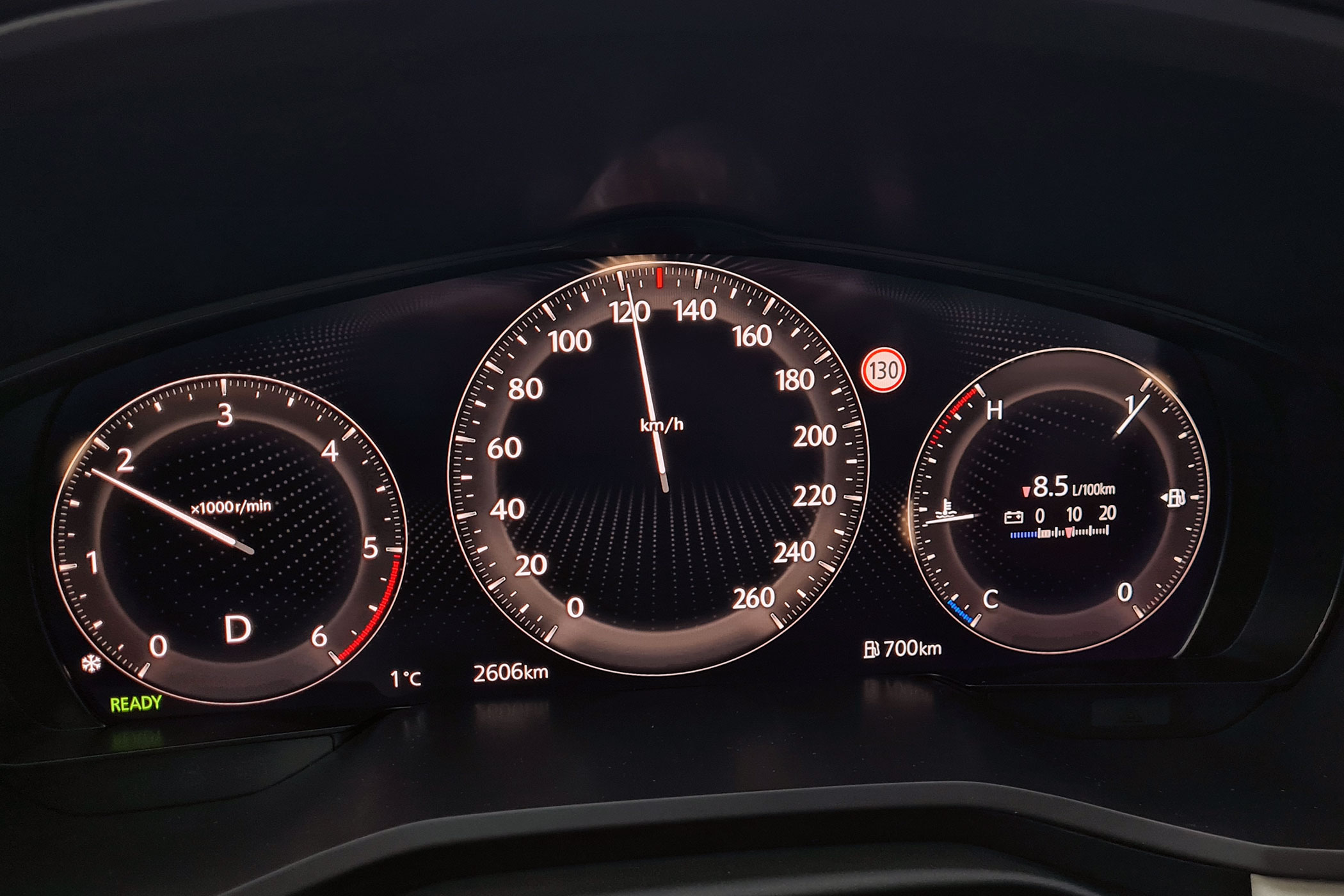 12,3” a középső kijelző képátlója is. Reakcióidői elfogadhatók, az Apple CarPlay és az AndroidAuto egyaránt fut rajta kábel nélkül is. Vezetés közben ez a felület monitorként viselkedik, elindulás után a Mazda letiltja az érintőképernyős funkciókat, helyette a forgó-nyomókapcsolóval lépkedhetünk a logikus felépítésű menüben.