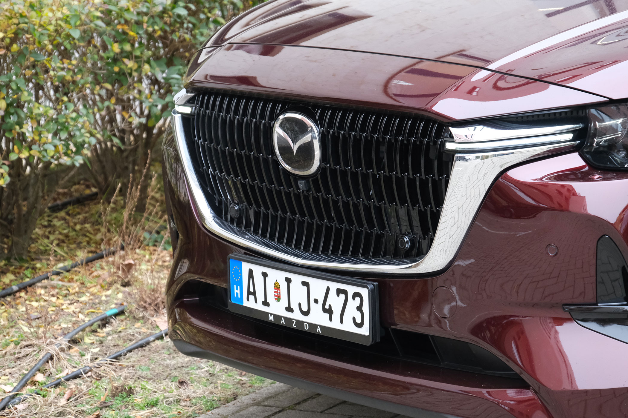 Látszik, hogy a CX-60-ból született a három üléssoros nagy testvér, a hűtőrács mintája és a csomagtér oldalablakának formája a legmarkánsabb különbség. A hosszú orral és ebben az érzékeny, de igazán egyedi Artisan Red színben, ami nekem inkább mélybordó, igazán tekintélyes autó.
