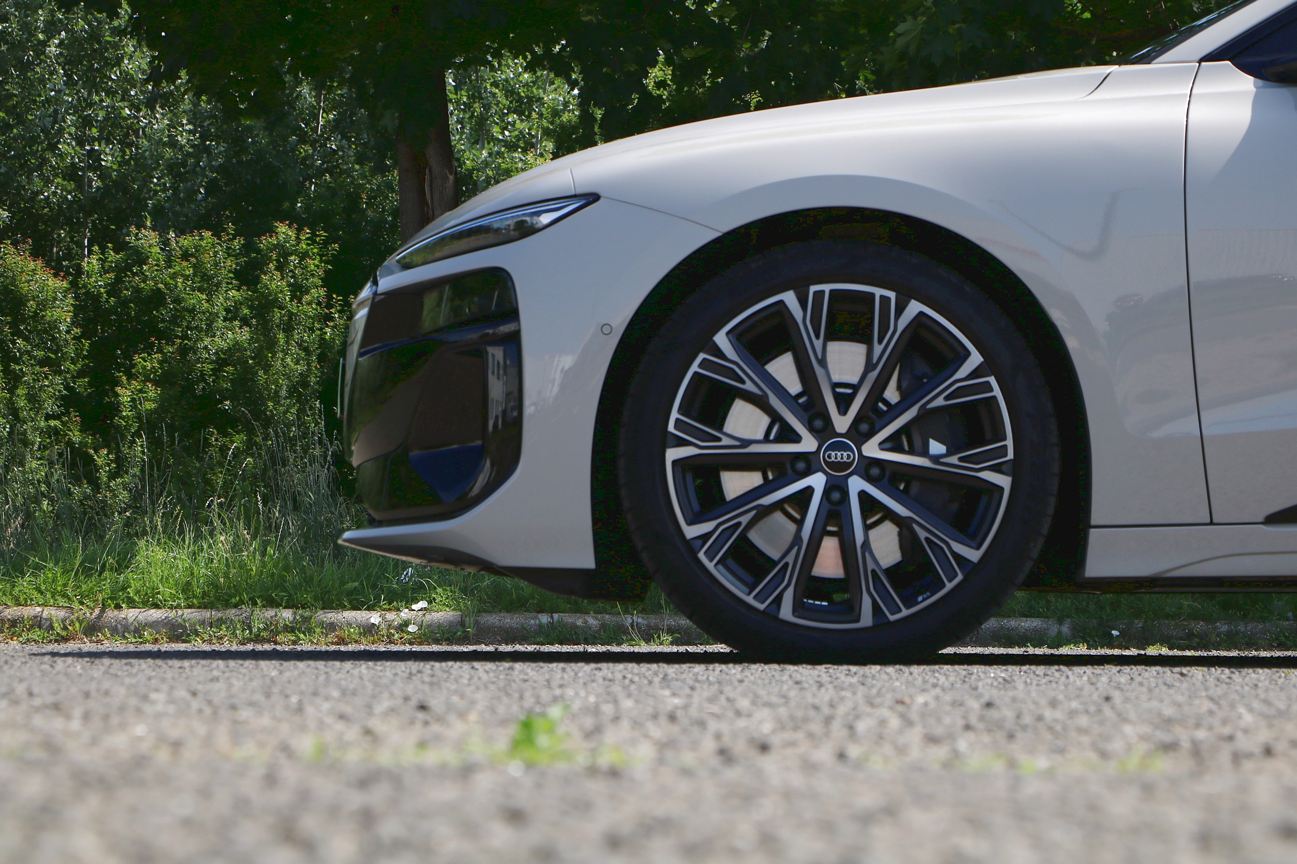 Az A6 e-tron alapból 19 colos felniken gurul, míg az S6 már 20 colosakat kap, de a fotókon látható, feláras 21 colos kerekekkel mutat igazán jól. Mögülük hatdugattyús, piros első féknyergek villannak ki, ami egy ilyen teljesítményű autónál szinte kötelező elem, még akkor is, ha a fékezés nagy részét már a visszatáplálás végzi.