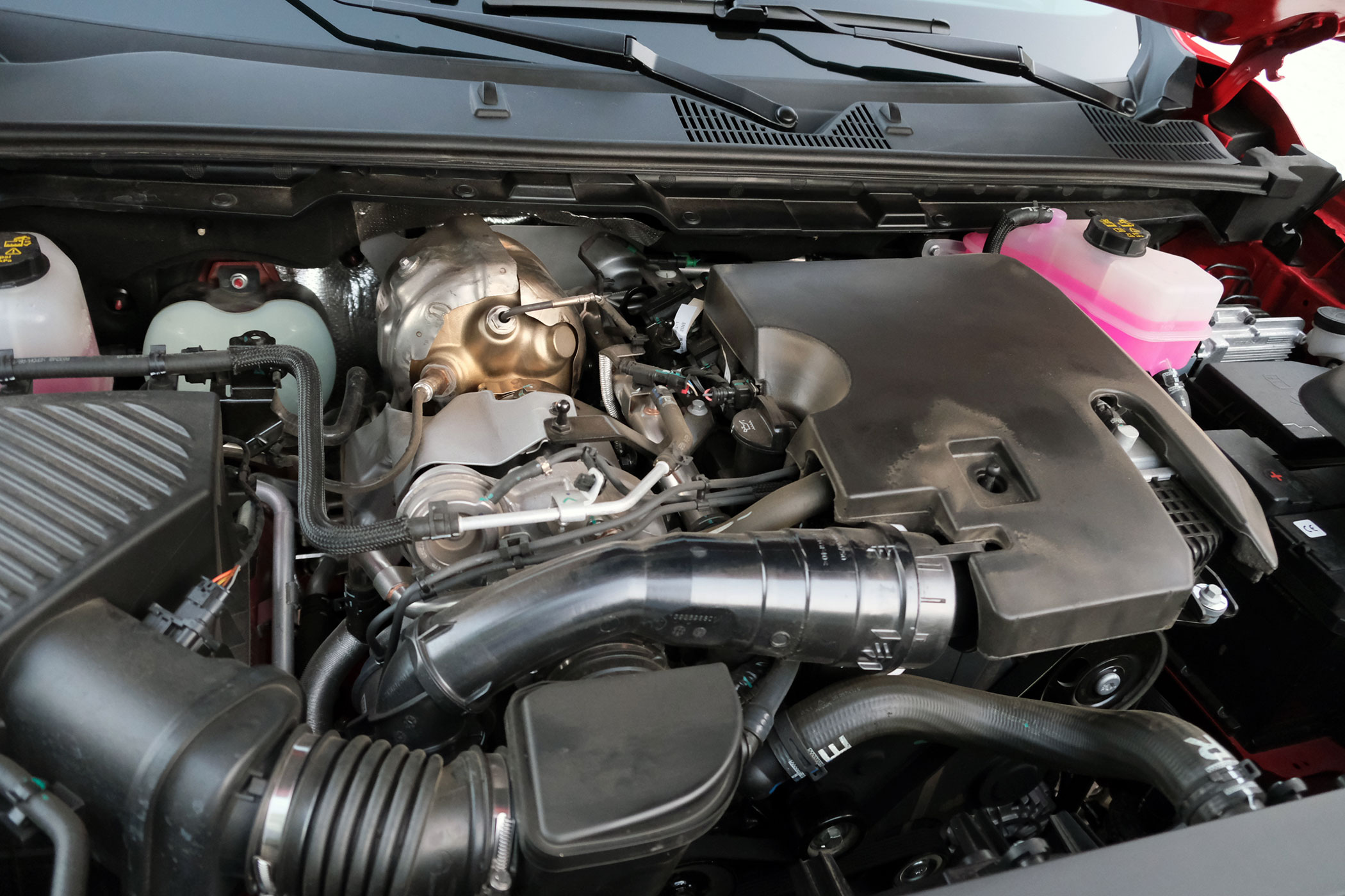 Burkolat nélkül az állítólag VW-eredetű dízel. A két turbófeltöltő hátul van a kipufogóval együtt