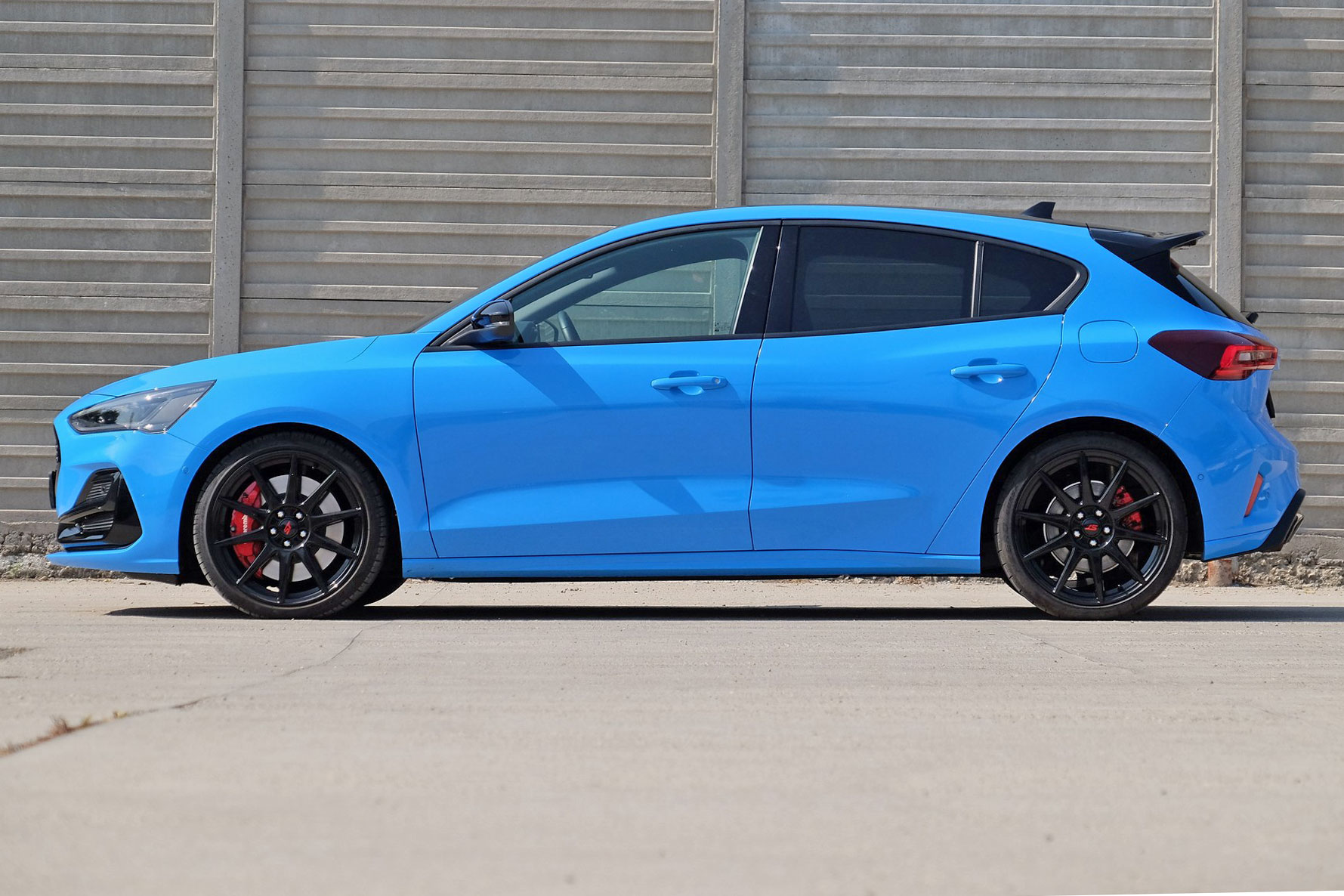 Maga a karosszéria 4393 milliméter hosszú, 1979 mm széles, és 1487 mm magas, tengelytávja 2,7 méter. Kintről nem csak a talajhoz látványosan közel hordott has – az ST alapból egy centiméterrel alacsonyabb a mezei változatnál, de ezt még további 2 centivel lehet csökkenteni a futómű otthoni piszkálásával – árulja el, mire képes a furcsakék Focus. Hanem az egyedi, speciális eljárással készített ultrakönnyű 19 colos könnyűfém keréktárcsák is, amelyek mögött rikító piros, Brembo márkájú féknyergek dolgoznak.