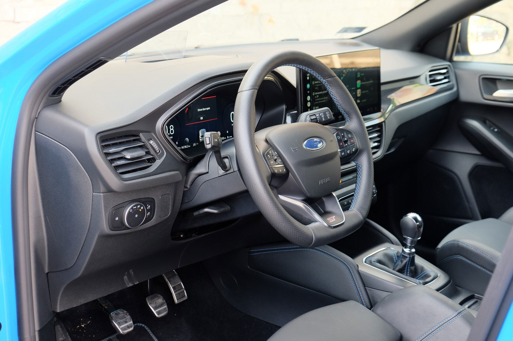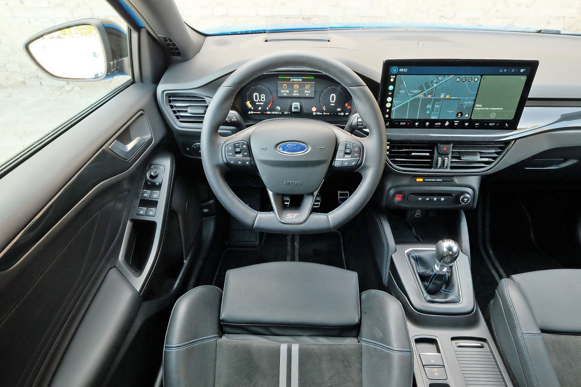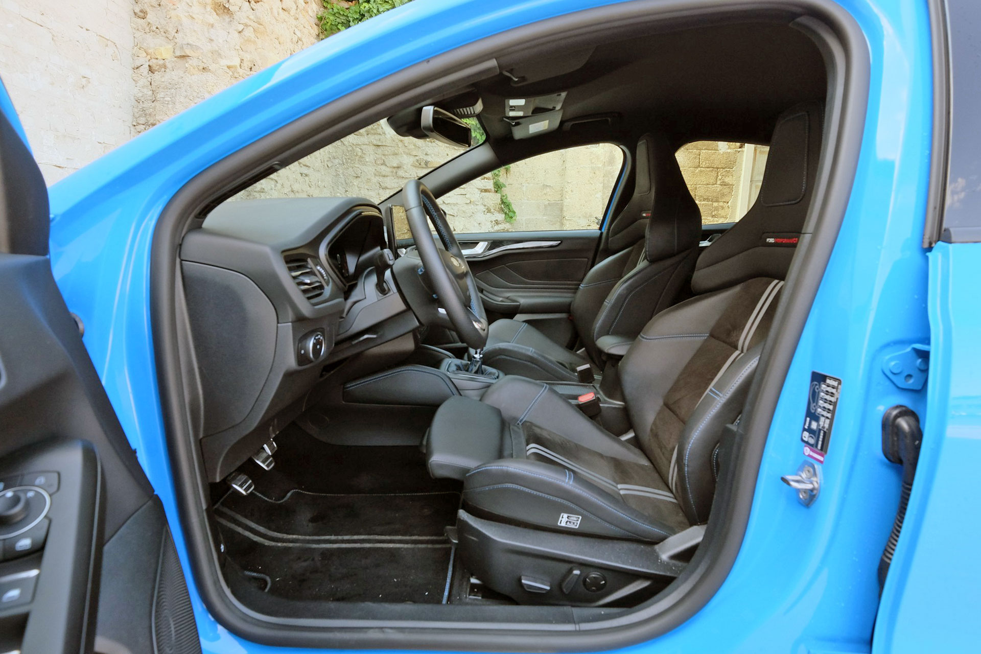 Komor, feketébe öltöztetett utastér vár a Focus ST Azura belsejében, amit a kormányon, váltószoknyán és a sportüléseken kék díszvarrások tesznek csinosabbá. Egyértelműen az első kagylóülések a leglátványosabbak a belsőben, amelyek AGR tanúsítvánnyal ‒ a hátbarát kialakítást igazolják ezzel ‒ is rendelkeznek. A háttámlával egybeépített fejtámla a magasabbaknak is kellő védelmet nyújt, az állítható ülőlaphosszúságú, ülések parádés oldaltartást adnak, még őrült kanyartempó mellett is.