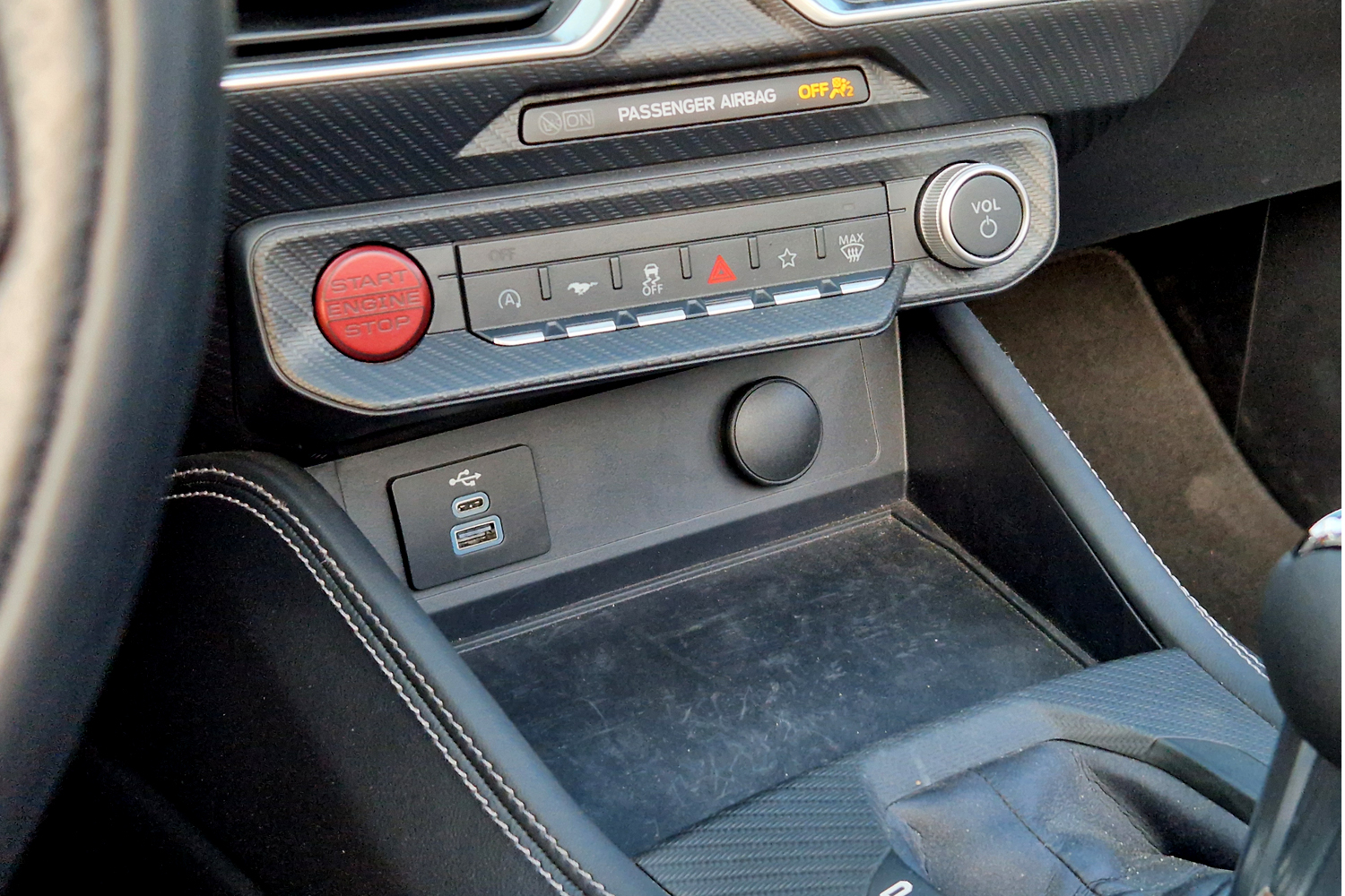 Praktikum szempontjából nem sportautós a Mustang, hiszen minden hétköznapi autóban meglévő rekesz itt is szerepel. Így a kesztyűtartó, az ajtózsebek, a pohártartók mellett a könyöklő alá is pakolhatunk.