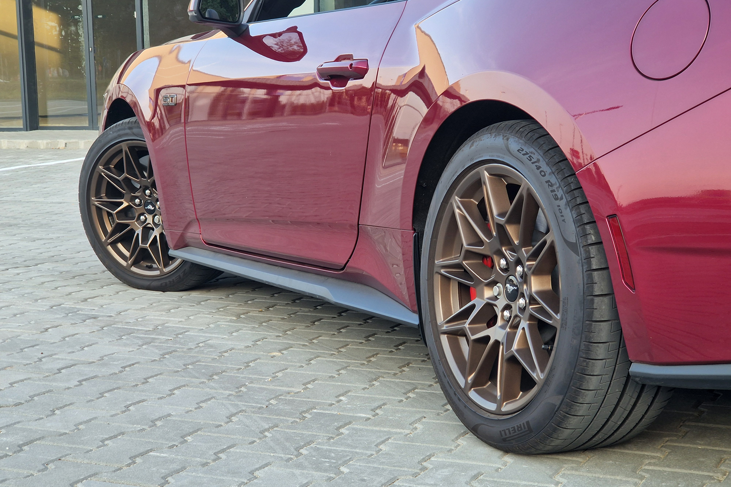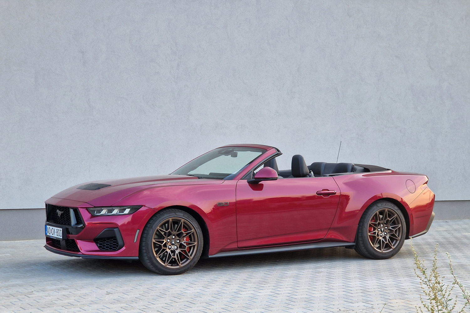 Azt hiszem, bármilyen színben ütős egy Mustang, de ebben a Molten Magenta nevű kivitelben, bronzszínű felnikkel és feliratokkal igazán Miami a hangulat.
