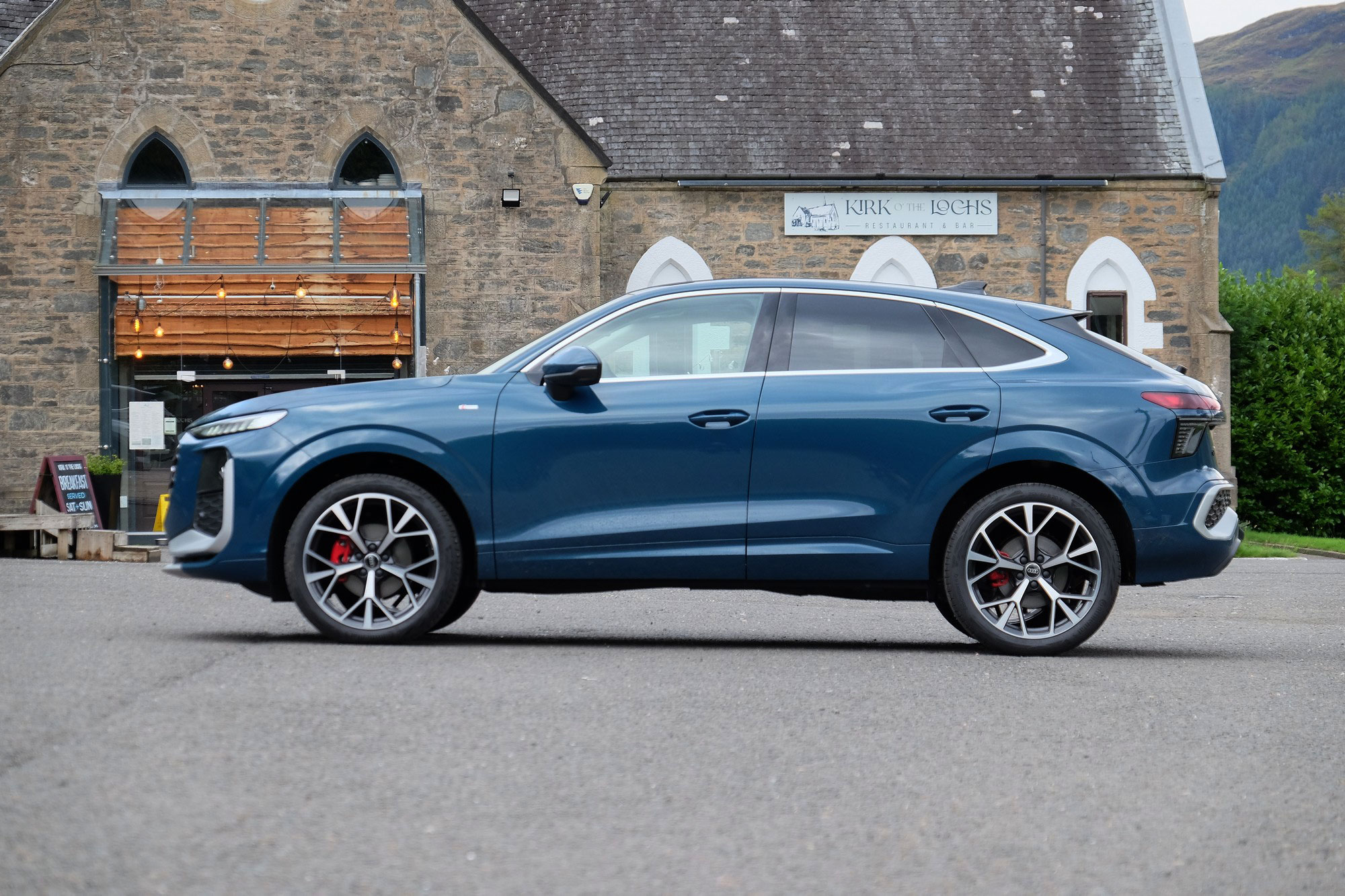 Az orron óriási lyukak tátonganak a nyolcszögletű, fényes fekete műanyagból készült, keret nélküli hűtőrácson. Oldalról nézve annak örülhetünk, hogy az Audi nem ragaszkodott ahhoz, hogy műanyagba mártsa az autót, így a kerékjárati ívek és a küszöbök is karosszériaszínűek. A SUV-változat innen nézve valamivel nagyobbnak tűnik attól, hogy a tető csak később kezd esni.