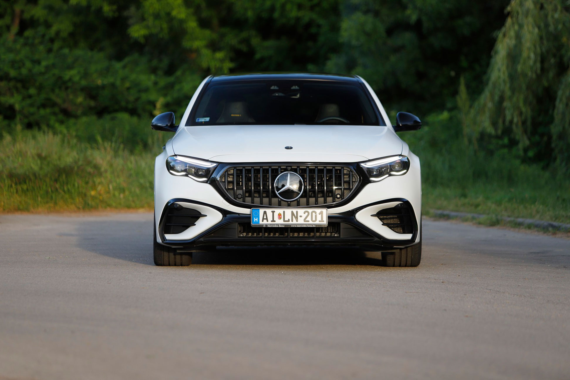 A Mercedes-Benz E-osztály hatodik ‒ más időszámítás szerint a tizenegyedik ‒ generációja 2023 óta van velünk, ez pedig a klasszikus négyajtós karosszéria egyik legsportosabb variánsa, tele minden jóval. Aminek látszania is kell az autó külsején. Nem kell aggódni, látszik is. Fekete krómkeretből néz ki a hűtőmaszk, amit nagy, függőleges rácsozás tölt ki. Ehhez kétoldalt hozzátapasztották a fényszórókat is, középen pedig még egy levesestányérnyi Mercedes-csillag is elfért.