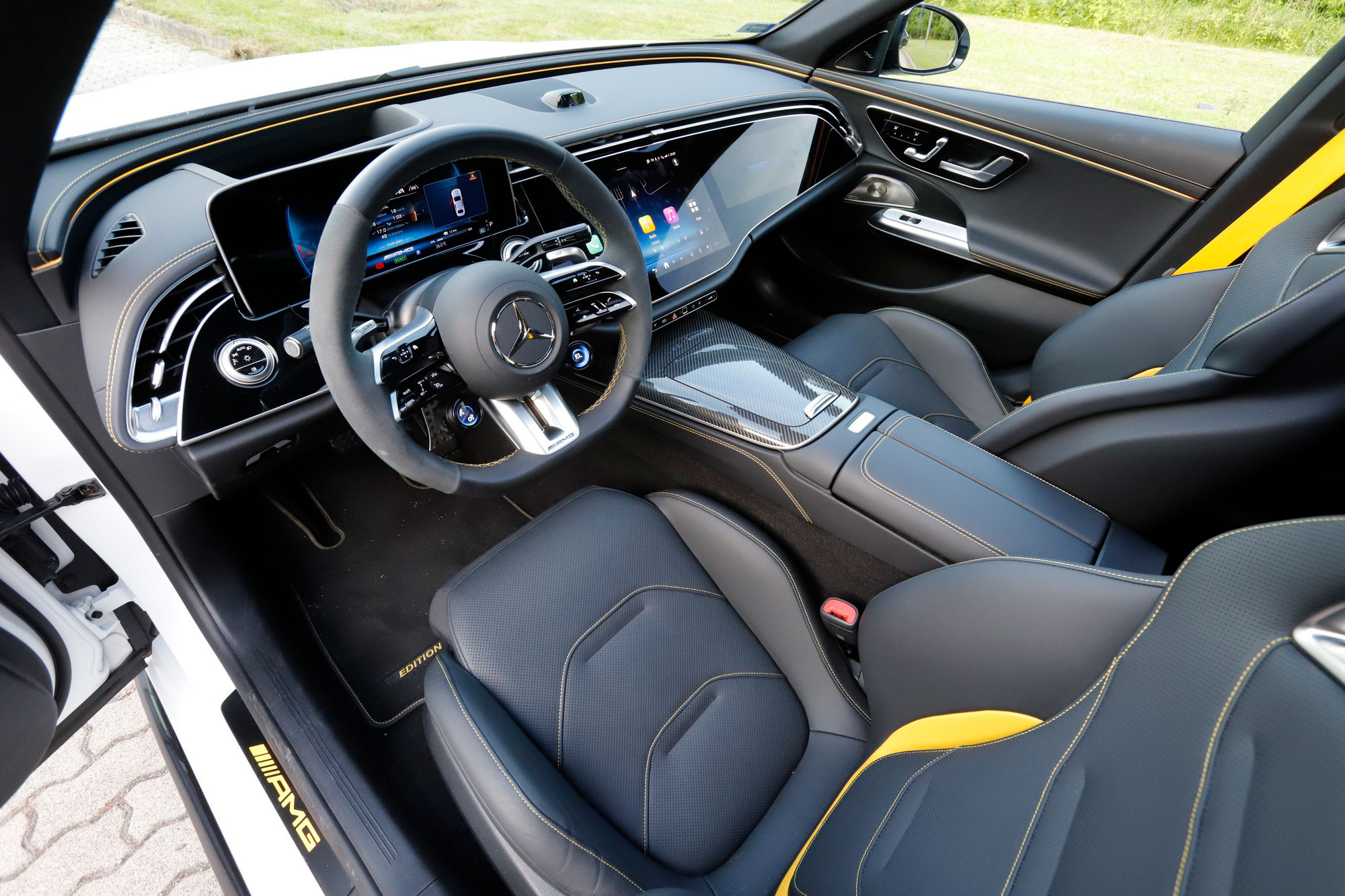A motorháztetőn pedig egy másik, kisebb, affalterbachi ‒ ez az AMG otthona ‒ embléma is került. Szintén feketék kétoldalt az óriási légbeömlők, amikre kontrasztos fehér elemek erősítenek rá és felniből is extra, 21 colos került az E-osztály alá. Karosszériájának hossza 4965 milliméter, szélessége 2065 mm és 1472 mm magas, tengelytávolsága 2971 mm.